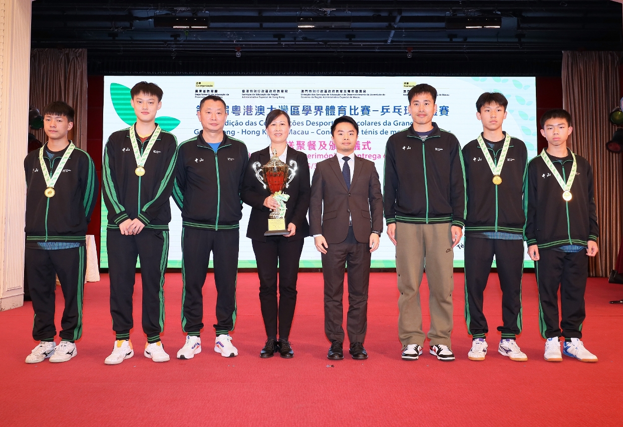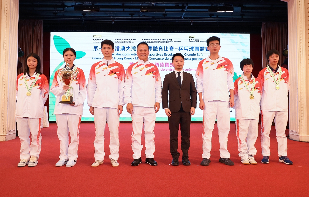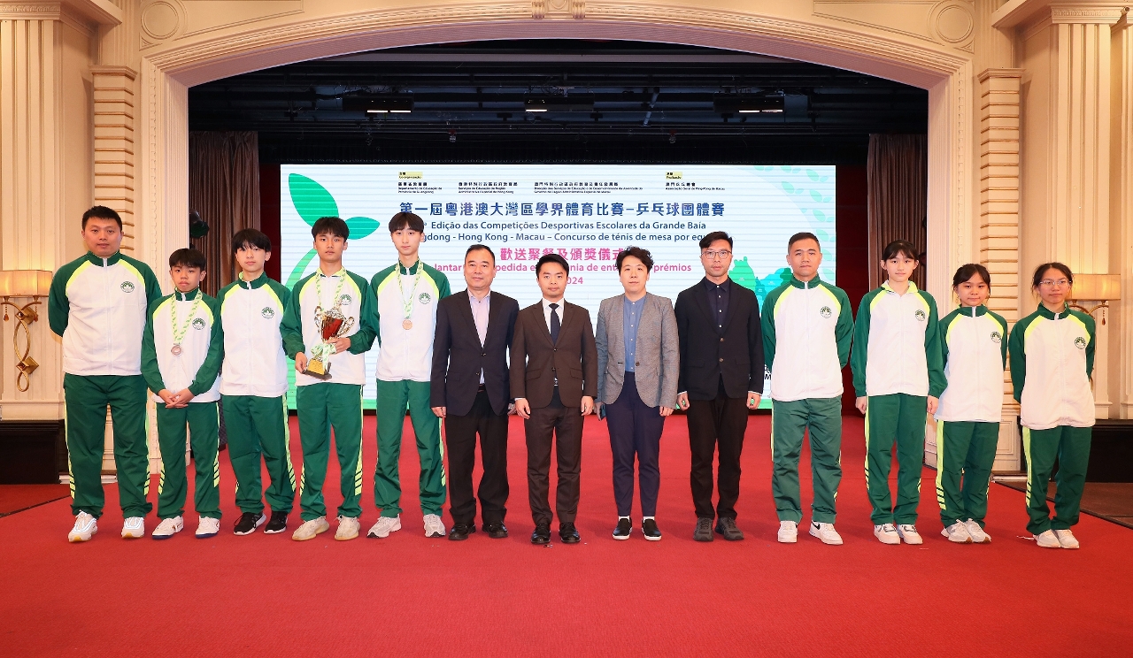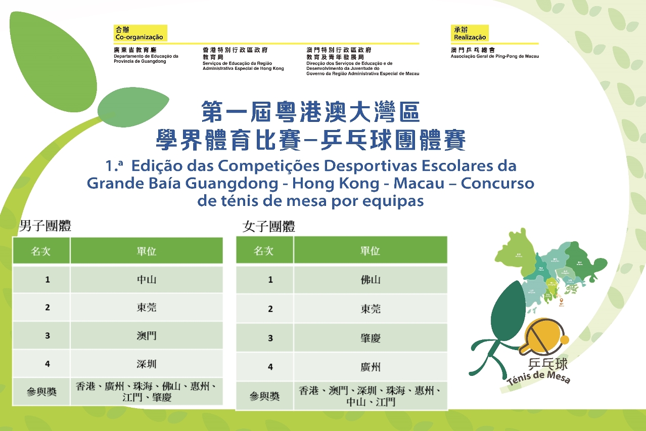 由廣東省教育廳、香港特別行政區政府教育局和澳門特別行政區政府教育及青年發展局合辦,澳門乒乓總會承辦的“第一屆粵港澳大灣區學界體育比賽─乒乓球團體比賽”已於2024年3月2日至6日一連五天在澳門順利舉行,分別由中山市和佛山市奪得男子組和女子組團體冠軍,澳門學界乒乓球代表隊奪得男子組團體季軍。