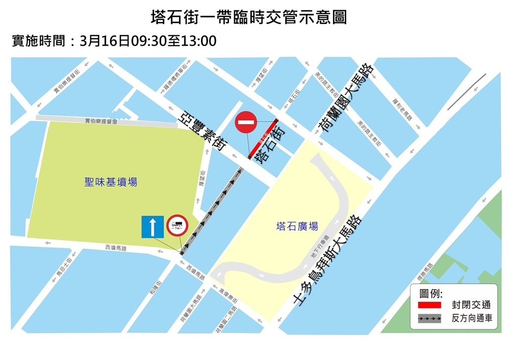 配合私人公司吊運冷氣設備工作,3月16日上午9時30分至下午1時,沙嘉都喇賈罷麗街與亞豐素街之間的一段塔石街實施封閉交通,亞豐素街與西墳馬路之間的一段實施反方向行車,並禁止長度超過7米之車輛駛入。