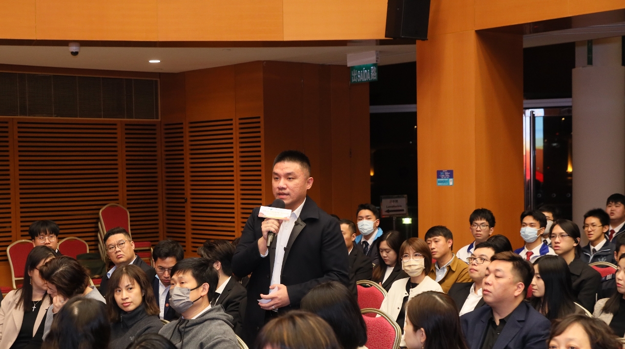 何潤生先生從兩會的熱門新詞和關鍵詞說起,以高質量發展、高水平對外開放、中國式現代化、美麗中國、生態環境保護等介紹政府工作報告的重要事項,分享兩會所聚焦的議題,傳達國家領導的講話重點,以及澳區代表委員在兩會的工作任務和建言資政等,指本年兩會的議程豐富扼要、務實高效,更是實現十四五規劃目標任務的關鍵之年,以穩中求進、以進促穩、先立後破總結本年國家發展的主要預期目標和暖心政策,勉勵本澳青年學生牢記使命,順應時代的潮流,把握國家發展方針,響應國家的號召,從教育優先、產業發展和助力深合區建設等方面,發揮高質量發展動力源作用,貢獻國家所需。