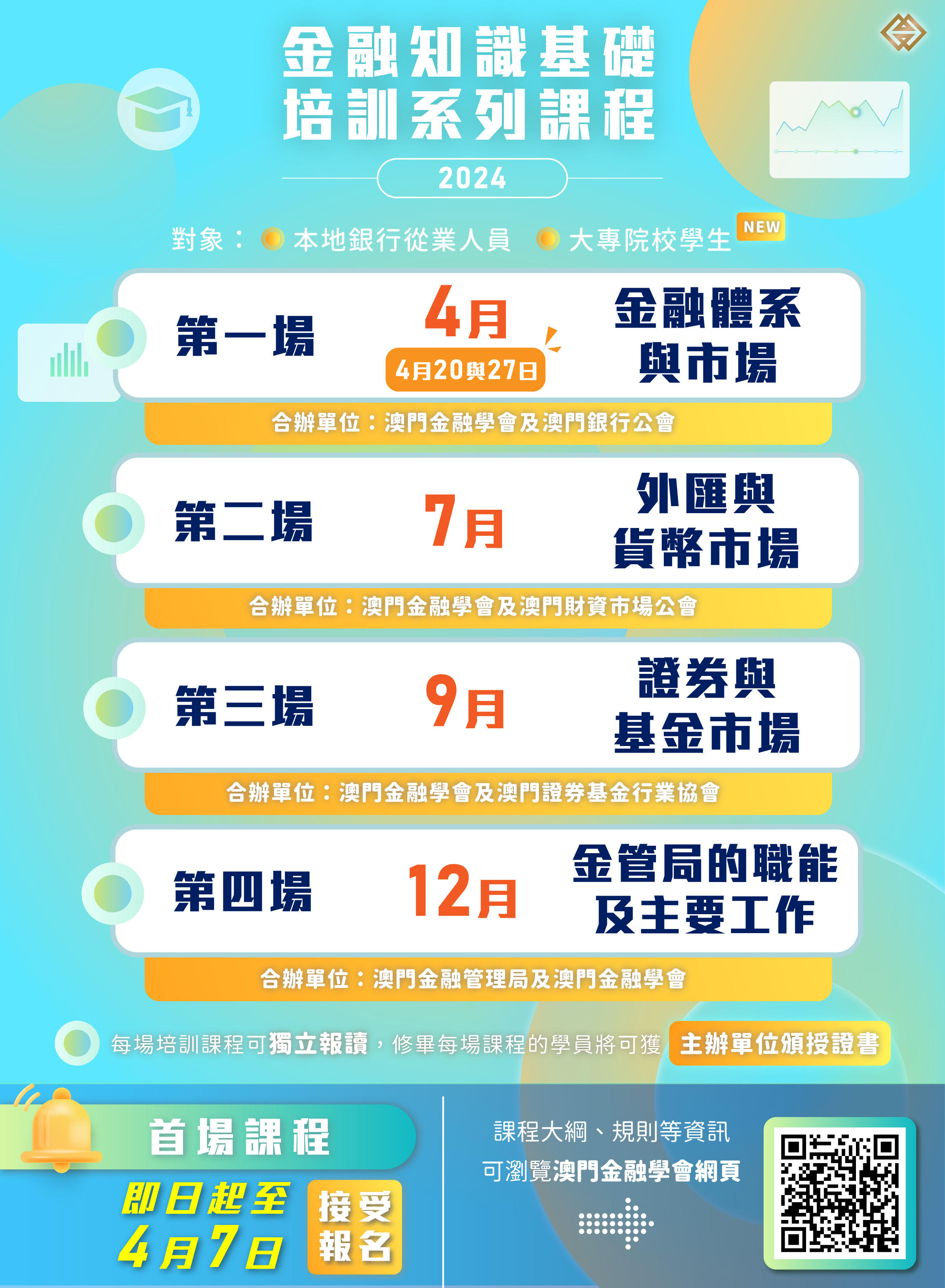 澳門金融管理局將聯同澳門金融學會、行業公會和協會,分別於2024年4月、7月、9月及12月,續辦四場以不同金融領域為題、具基礎性及普及性的“金融知識基礎培訓系列課程”,並將培訓對象由新入職及有意轉換工作崗位的本地銀行從業員,延伸至有意投身銀行業的在讀大專院校學生,冀透過系統性及持續性的培訓,幫助學員提早掌握行業實務知識,以更好地與實際工作崗位相接軌,為“1+4”產業發展儲備金融人才。首場課程即日起接受報名。