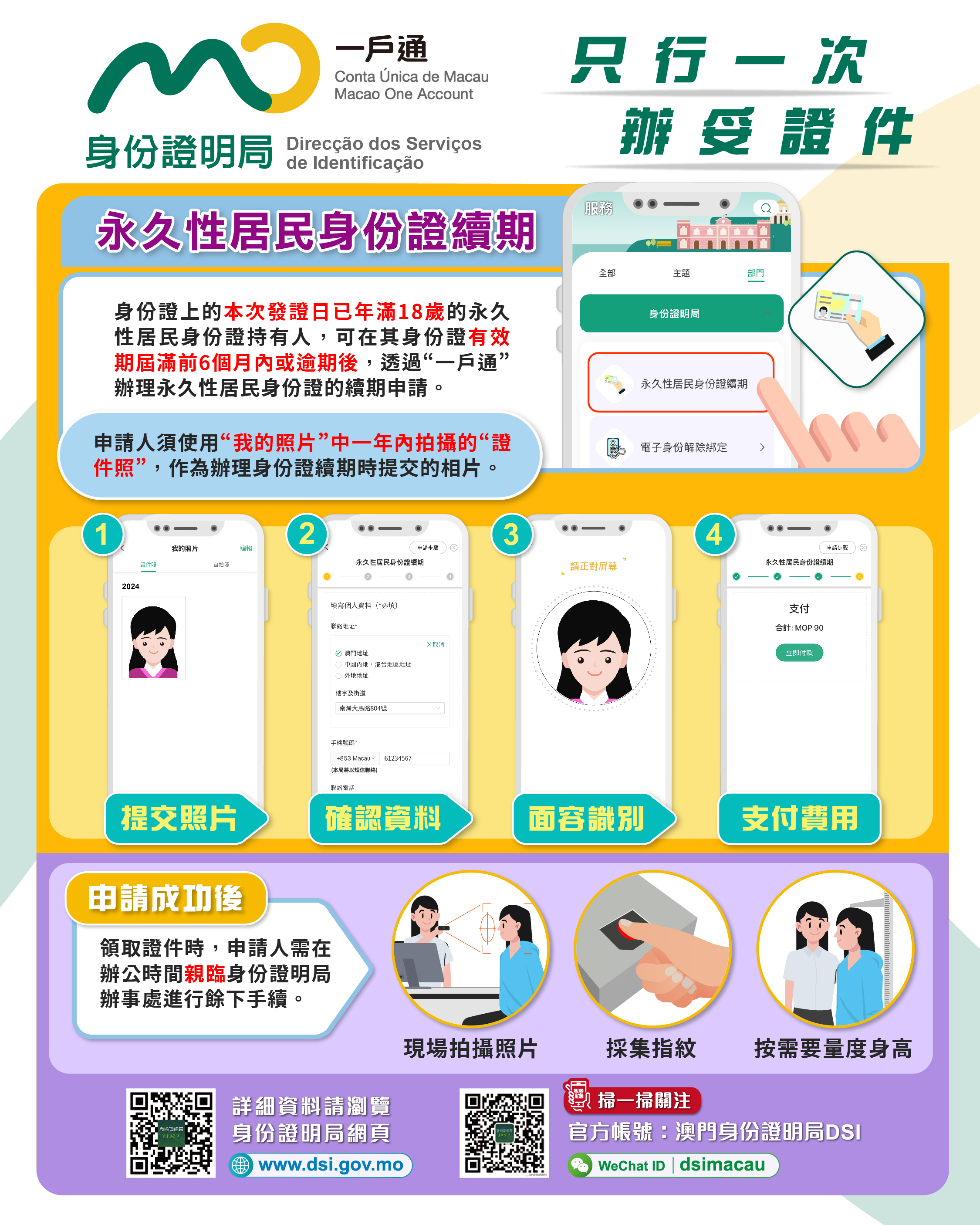 為方便居民快捷更換身份證,繼推出七個政府24小時自助服務中心可自助辦證及領證後,身份證明局今(15日)起於“一戶通”推出網上辦理永久性居民身份證續期服務,實現居民“只行一次、辦妥證件”的目標。