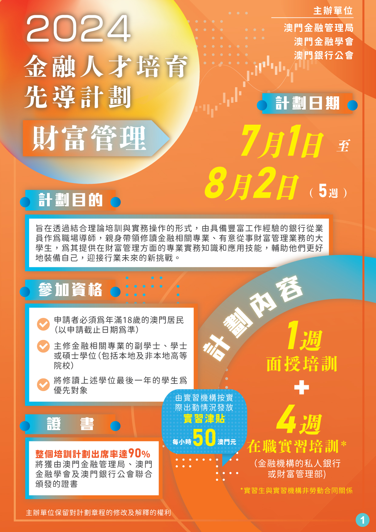 為落實特區政府“1+4”規劃中提出有關發展現代金融業的主要任務,澳門金融管理局與澳門金融學會及澳門銀行公會,於今年暑假將續推“金融人才培育先導計劃—財富管理”(“先導計劃”),為有意投身金融業的在讀學生提供培訓及實習機會,協助其提升職場適應力及競爭力。先導計劃由今(18)日起至4月12日接受報名。