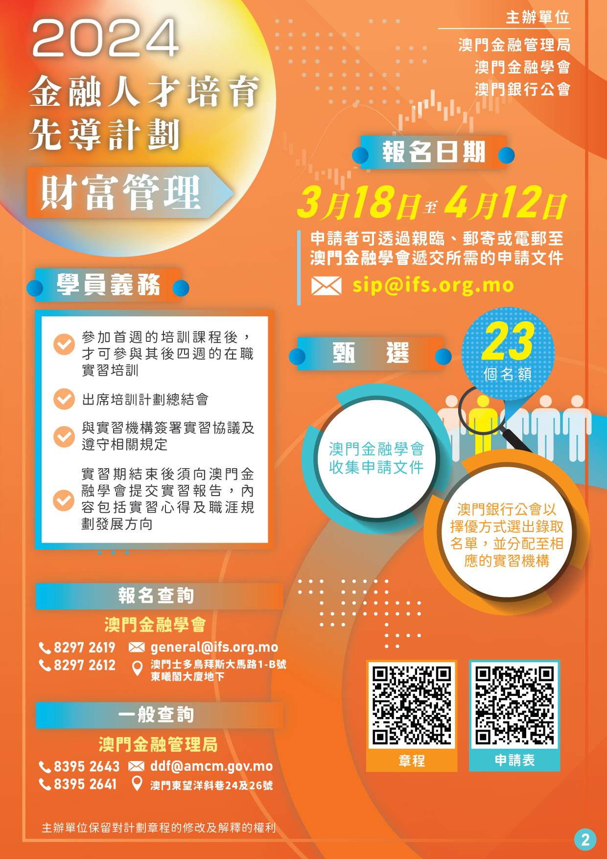 先導計劃報名期由即日起至2024年4月12日截止,對象為正在修讀金融相關科系、有意從事財富管理業務的大專院校學生,且必須為年滿18歲的澳門居民。符合資格且有興趣的人士可於上述期間透過澳門金融學會報名,主辦單位將甄選23名學生參加計劃,錄取名單預計於5月下旬公佈。