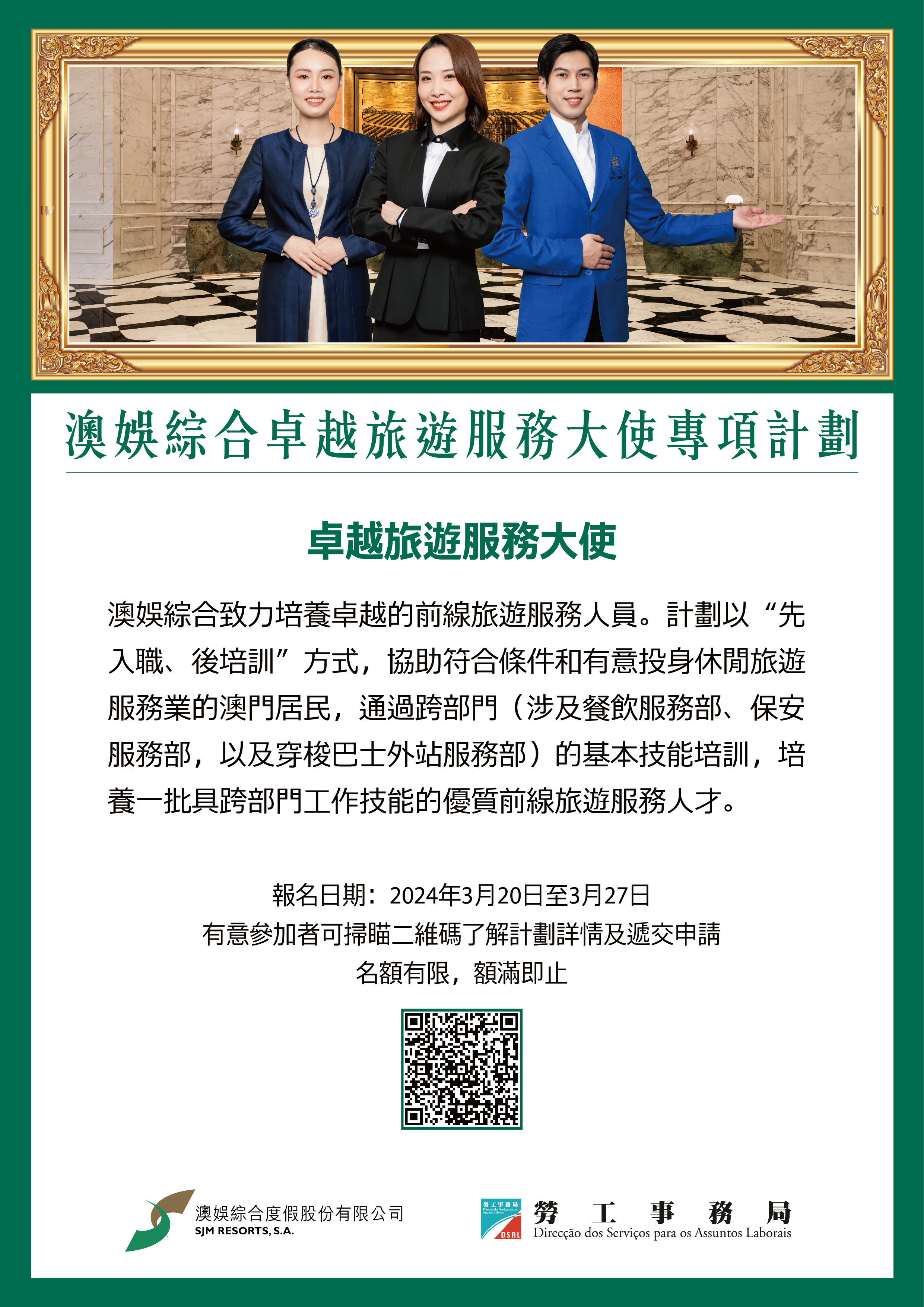 勞工事務局與澳娛綜合度假股份有限公司(下稱“澳娛綜合")合作推出“澳娛綜合卓越旅遊服務大使專項計劃"(下稱“計劃”),以“先入職、後培訓"方式,協助符合條件和有意從事休閒旅遊服務業的澳門居民,通過涉及餐飲服務部、保安服務部,以及穿梭巴士外站服務部的跨部門基本技能培訓,培養一批具跨部門工作技能的優質前線旅遊服務人才。計劃由3月20日起接受申請。