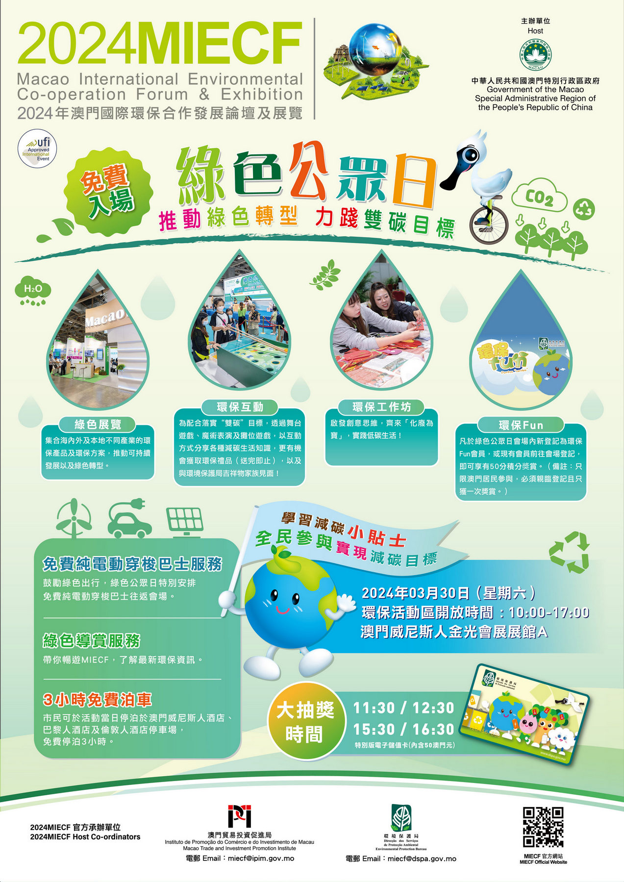 由澳門特別行政區政府主辦、澳門貿易投資促進局及環境保護局承辦的“2024年澳門國際環保合作發展論壇及展覽”(2024MIECF)將於2024年3月28至30日舉行,以“推動綠色轉型 力踐雙碳目標”為主題,展會最後一日(3月30日)定為“綠色公眾日”,免費開放予公眾入場,通過MIECF這平台讓公眾了解最新環保資訊和技術,傳遞環保知識,倡導共創綠色未來。