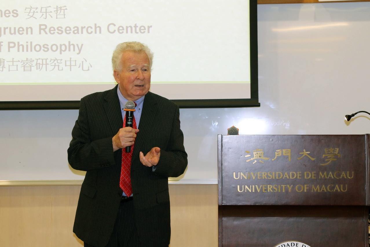 澳大人文學院助理院長鄺耀基致辭時強調哲學對於人文學科研究的重要性。人文學院副院長、哲學與宗教學系特聘教授王慶節介紹了安樂哲的學術成就,指其不僅是中國哲學領域和實用主義哲學的專家,亦是一位優秀翻譯家和多產作者,其演講能為大眾帶來一場哲學思想的盛宴。