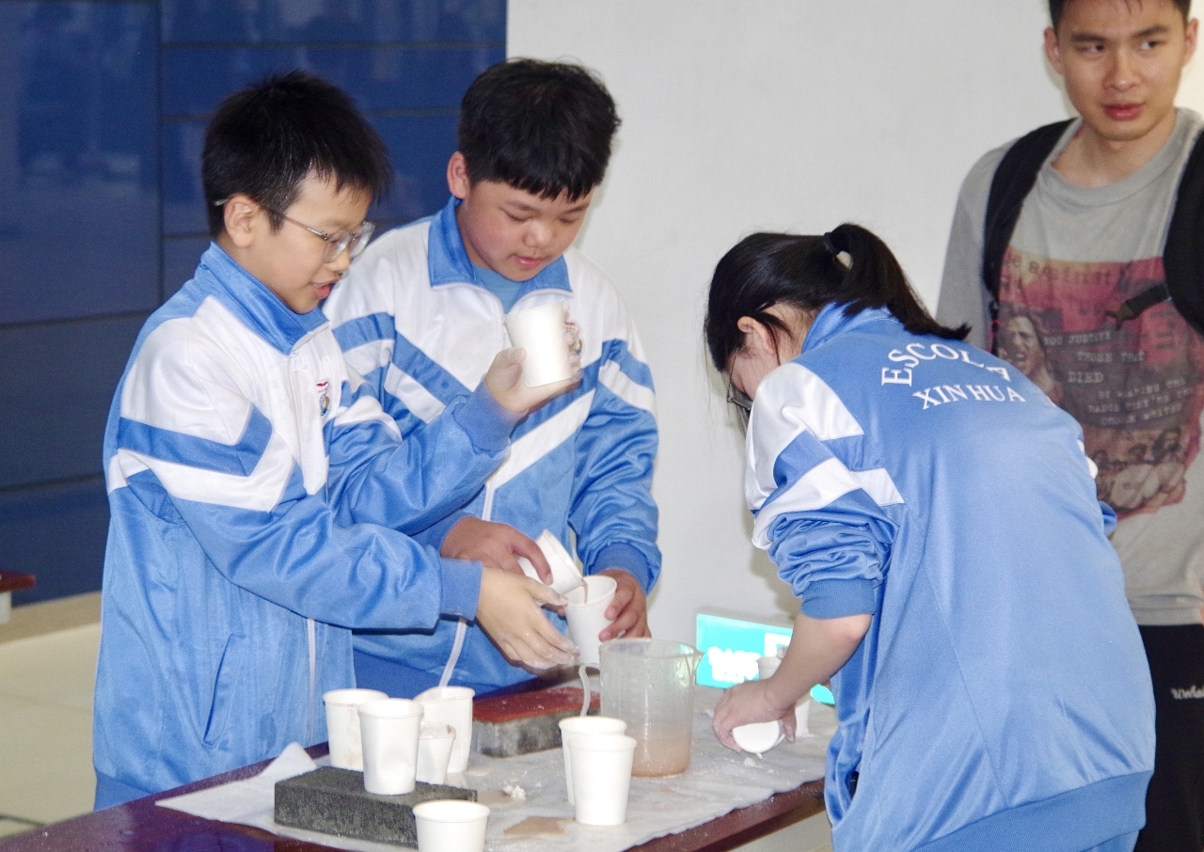 在科學遊戲環節,澳大10多名博士生和碩士生帶領小學生親自動手,開展“從‘一盤散砂’到‘穩如泰山’——加筋砂土的超強韌性”和“無孔不入,吸蓄滲淨——會呼吸的海綿城市”的科學遊戲。