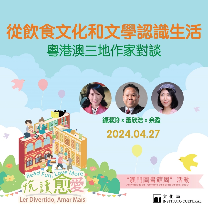 為配合2024年“4‧23澳門全城共讀日”,推動閱讀風氣,文化局於“澳門圖書館周”帶來多個項目,其中將邀請三位大灣區飲食作家舉辦“從飲食文化和文學認識生活——粵港澳三地作家對談”,與觀眾一探大灣區的飲食文化和歷史內涵,同時品味文學中的美食與生活。講座以粵語進行,免費入場,歡迎有興趣人士報名參加。