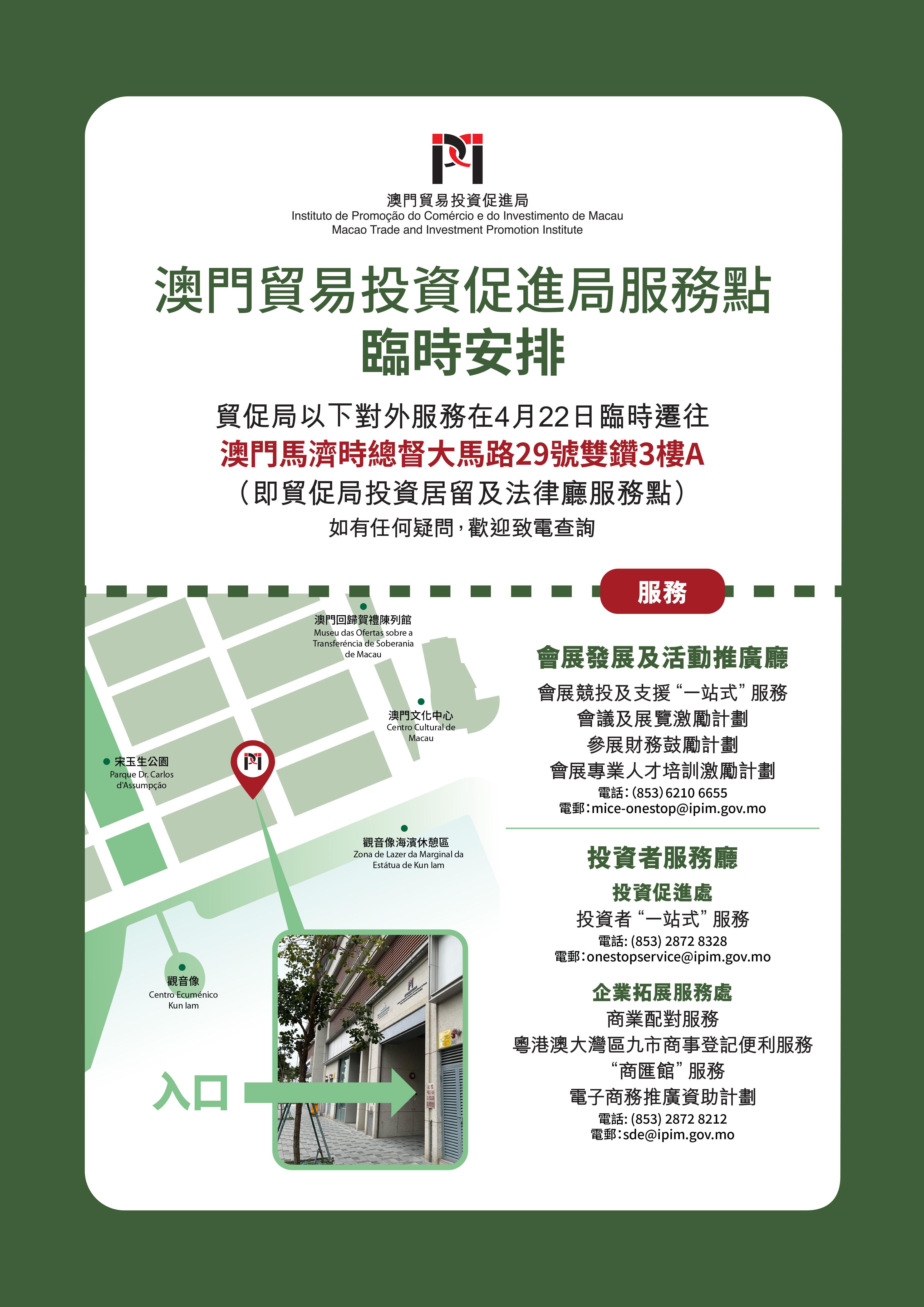 因內部工作安排,澳門貿易投資促進局部分對外服務將於4月22日,臨時遷往澳門馬濟時總督大馬路29號雙鑽3樓A(即貿促局投資居留及法律廳服務點)。