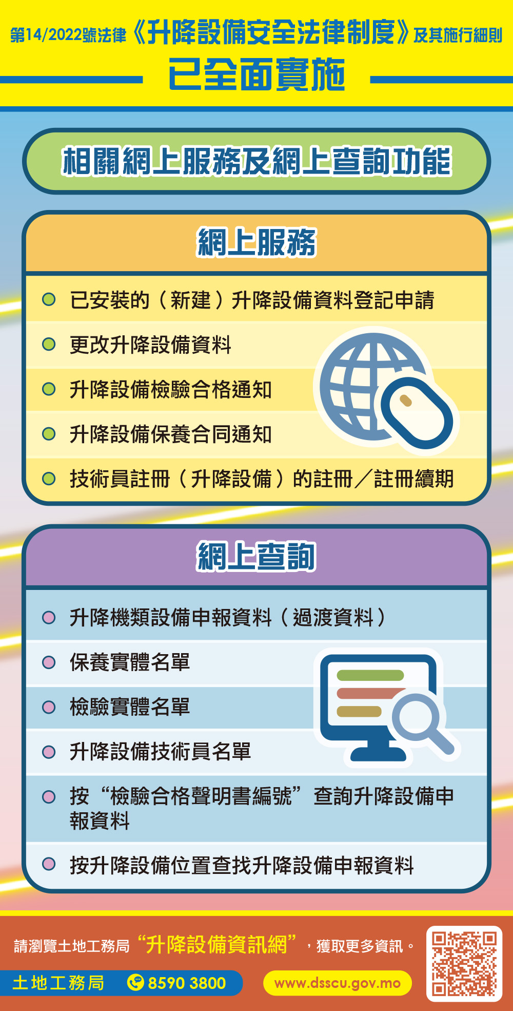 第14/2022號法律《升降設備安全法律制度》及相關配套法規於4月1日正式實施,為配合推動電子政務,便利市民和業界,土地工務局新增多項網上服務及查詢功能,包括升降設備資料登記、檢驗合格及保養合同通知,以及查閱設備申報資料、相關實體和技術員名單等。