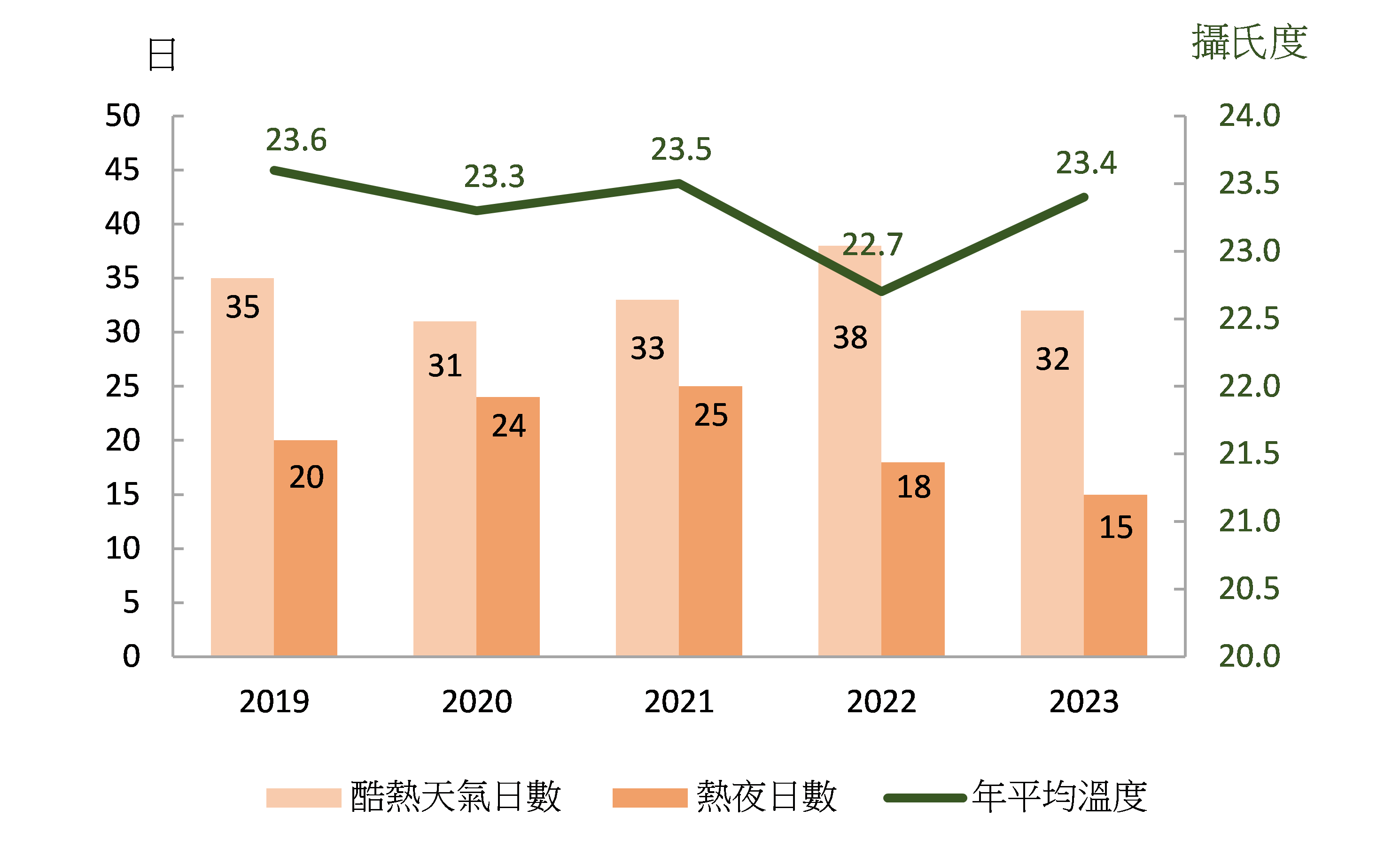 統計暨普查局資料顯示,2023年本澳平均氣溫錄得23.4攝氏度,較氣候平均值(1991-2020)高出0.6攝氏度;其中,10月錄得的月最高氣溫為35.2攝氏度,更打破歷年同期最高紀錄。全年酷熱天氣(日最高溫在33℃ 或以上)有32日,熱夜日數(日最低溫在28℃ 或以上)有15日,分別較氣候平均值(1991-2020)增加0.7日和3.5日,而寒冷天氣(日最低溫在12℃ 或以下)則減少13.1日至26日。