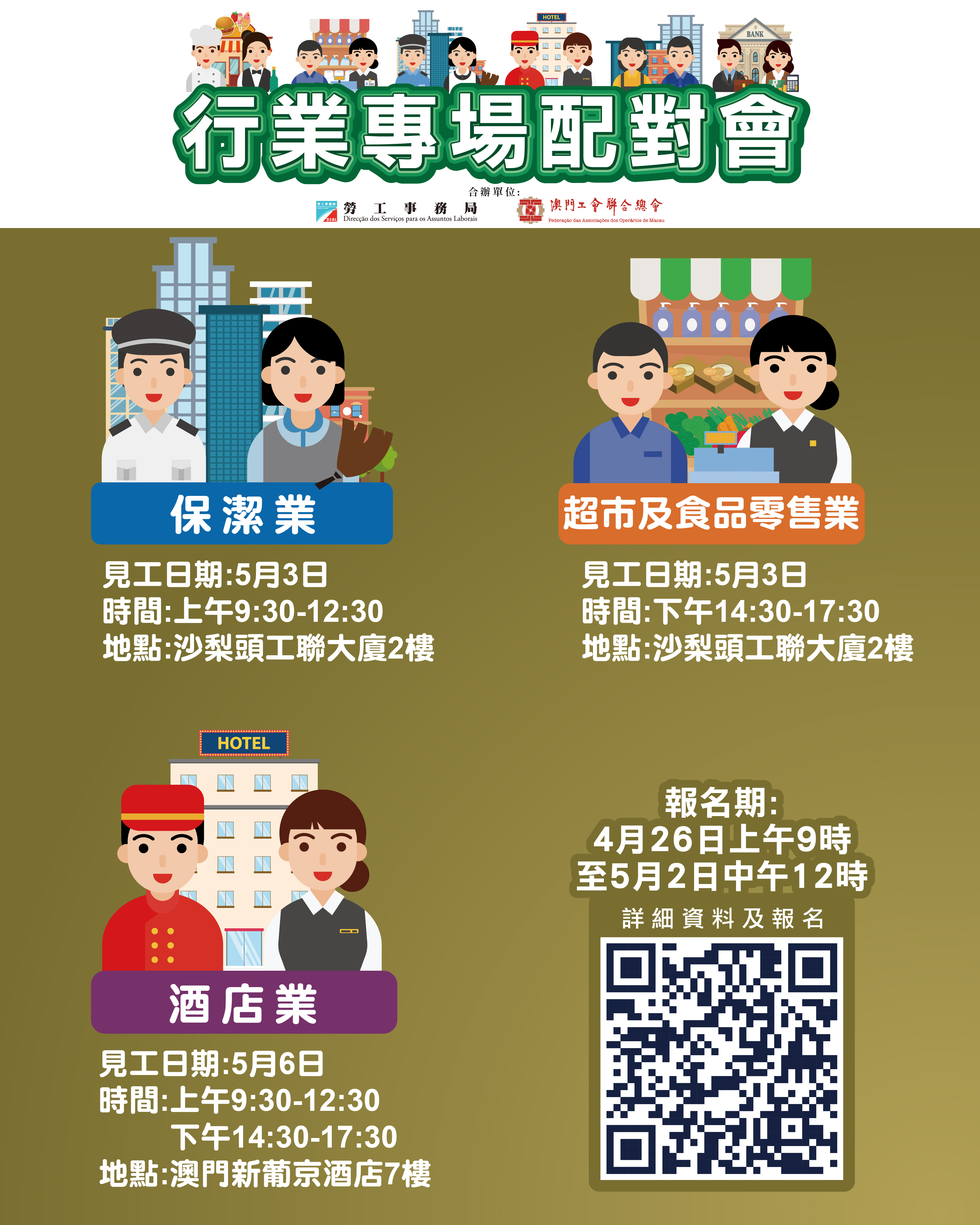 上述5月3日上午保潔業配對會及下午超市及食品零售業配對會在澳門工會聯合總會二樓(沙梨頭海邊街2-6號工聯大)舉行;5月6日酒店業配對會在澳門新葡京7樓舉行。報名日期為4月26日上午9時至5月2日中午12時。