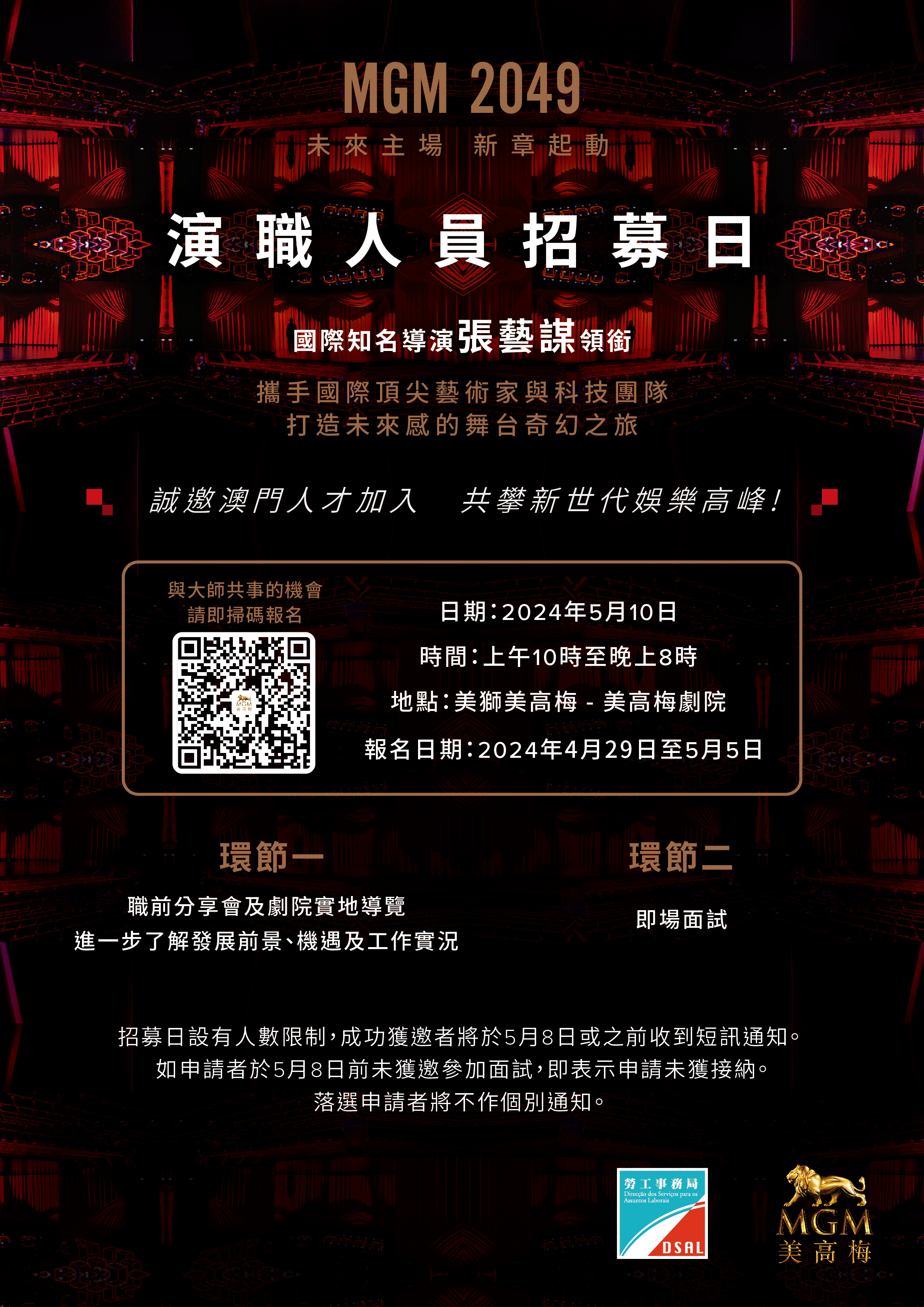 勞工事務局和美高梅金殿超濠股份有限公司(下稱“美高梅")合作舉辦專場配對會,為於12月美高梅與內地知名導演張藝謀及國際重量級創作團隊打造的「MGM 2049」駐場秀招募演藝人員,歡迎有意投身表演藝術行業的澳門居民,由4月29日起接受申請。