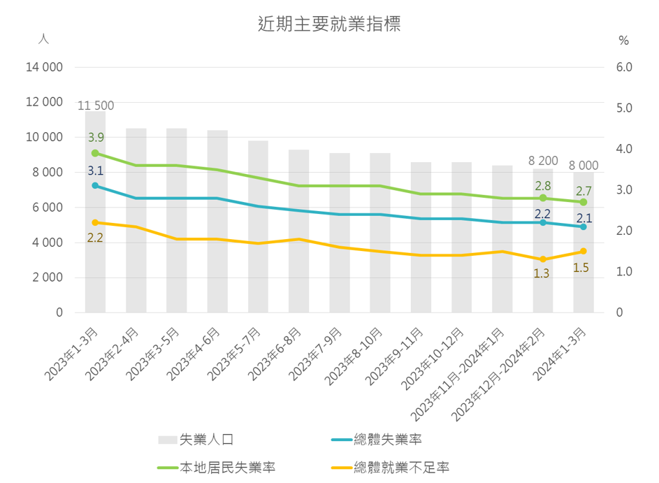 統計暨普查局資料顯示,2024年第1季總體失業率為2.1%,本地居民失業率為2.7%,按季均下跌0.2個百分點;就業不足率則微升0.1個百分點至1.5%。