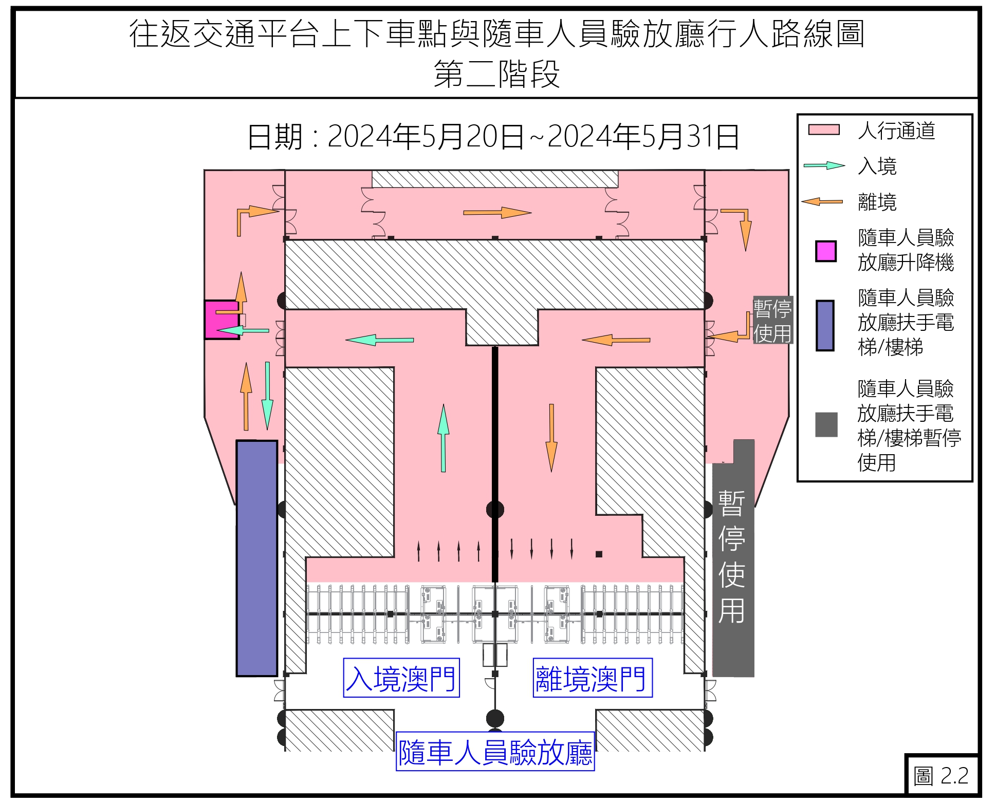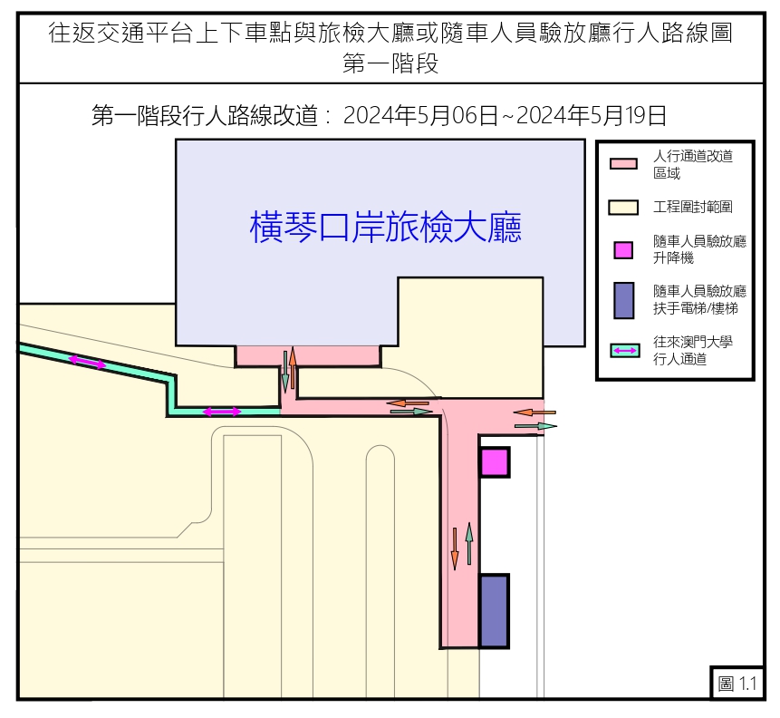 1. 由5月6日起至5月31日,旅檢大廳出入口之扶手電梯及升降機將分階段臨時封閉,行人可留意現場有關標識標示牌的指示,來往旅檢大廳及上落客點;經由隨車人員驗放廳入境澳門之隨車人員,需按照有關標識牌指示,步行至指定升降機或扶手電梯前往二層上落客點候車,詳細路線見圖1.1、1.2及圖2.1、2.2;