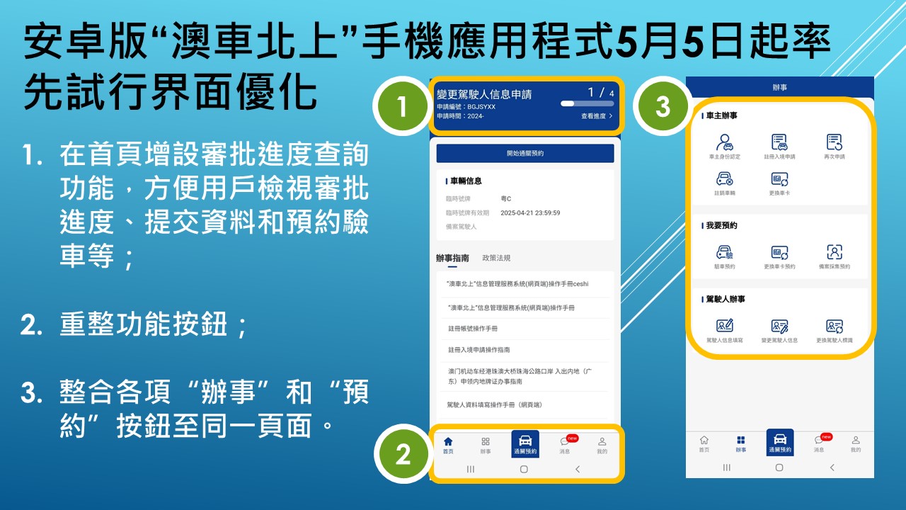 為進一步提升用戶體驗,安卓版(Android)“澳車北上”手機應用程式(App)5月5日起率先試行界面優化,是次優化主要按照用戶使用習慣重整功能按鈕、整合各項“辦事”和“預約”按鈕至同一頁面,以及在首頁增設審批進度查詢功能,方便用戶檢視審批進度、提交資料和預約驗車等。蘋果版(iOS)“澳車北上”手機應用程式的優化更新正在調試中,將按序推出。