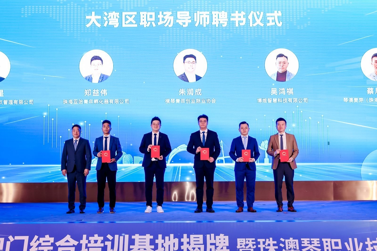 活動還舉行了“大灣區職場導師”聘書頒發儀式,5位有內地職場經驗和生活經歷的澳門居民獲頒聘書。“大灣區職場導師計劃”由橫琴合作區民生事務局與澳門旅遊大學合作發起,是落實廣東省支持港澳青年在粵港澳大灣區就業創業的相關政策,以及雙方簽署的《關於共同推進職業技能建設合作事宜的備忘錄》的重要舉措之一。本次獲得聘書的5名職場導師,聘期三年,將為到橫琴合作區就業創業的港澳青年提供職業發展指導、實習見習、崗位推薦、創業諮詢等服務,為簽約學員在合作區就業創業領航賦能。