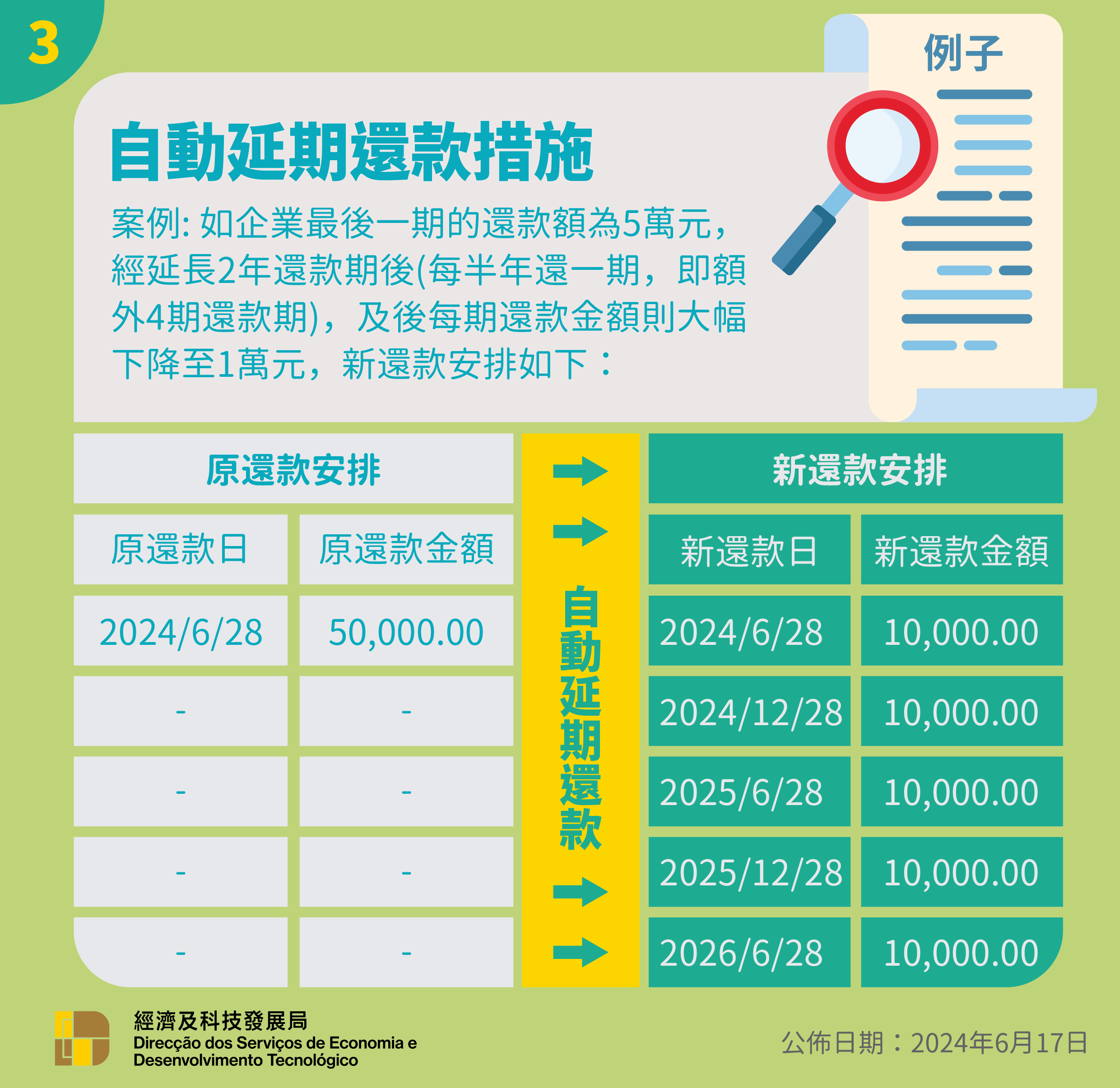 有關是次自動延長還款期措施的詳情、問題集、圖文包等資訊將上載至經科局網站自動延長還款期措施專區。如有任何查詢,可於辦公時間內致電2888 2088或透過微信服務號“DSEDTONLINE”與經科局聯繫。