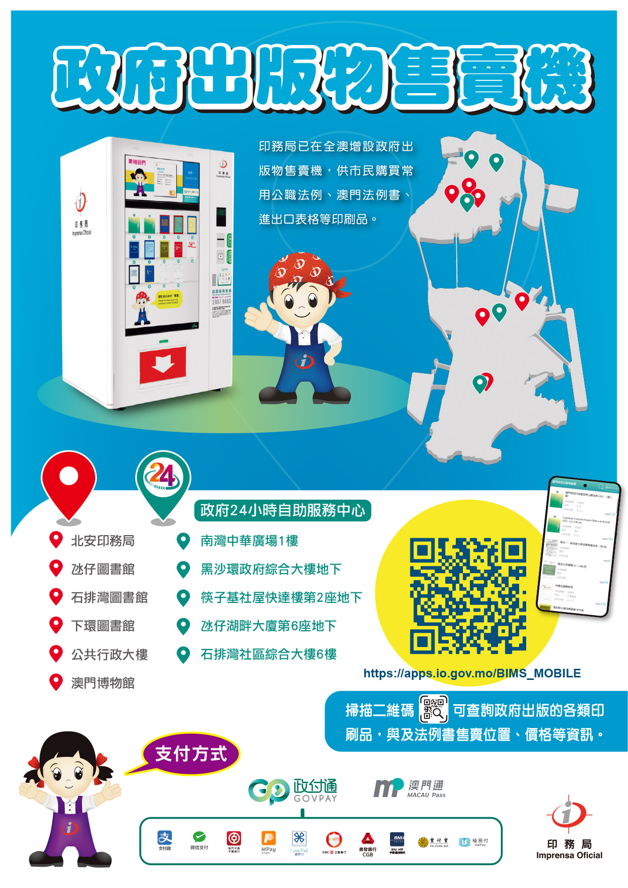 為了方便市民及企業購買政府出版的印刷品(如書刊、表格),印務局於五個政府24小時自助服務中心設置政府出版物售賣機,有關中心分別位於南灣、黑沙環、筷子基、湖畔以及石排灣。本次推出的售賣機為全新型號,其屏幕更大,可展示更多產品訊息,同時採取全密封設計,以更好保護印刷品不易被光線損壞。市民在選購書刊時,可用手機掃描二維碼以查閱該書刊的目錄,此外亦可透過印務局網上書店網頁(https://publication.io.gov.mo),隨時查詢各區售賣機位置和售賣產品款式。