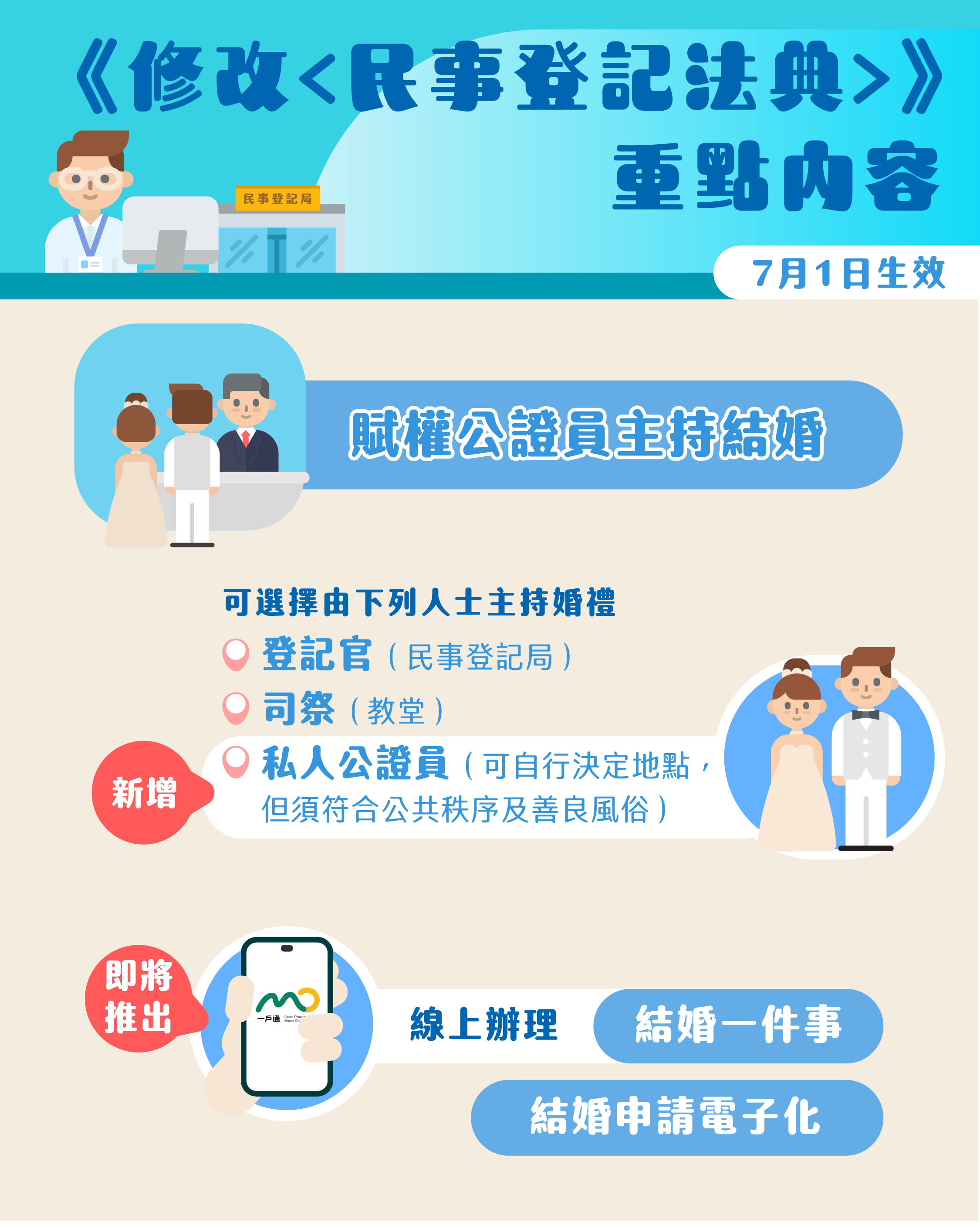 由即日起,居民在結婚申請獲批後,除在民事登記局辦理結婚登記外,亦可由私人公證員在民事登記局以外地方主持結婚;取消出生簡報(俗稱“白咭”)及死亡簡報(俗稱“落葬紙”),民事登記局向申請人免費發出首份證明。同時,隨著法律生效,民事登記局亦與本地醫院建立數據互聯,居民無需前往該局辦理死亡登記。