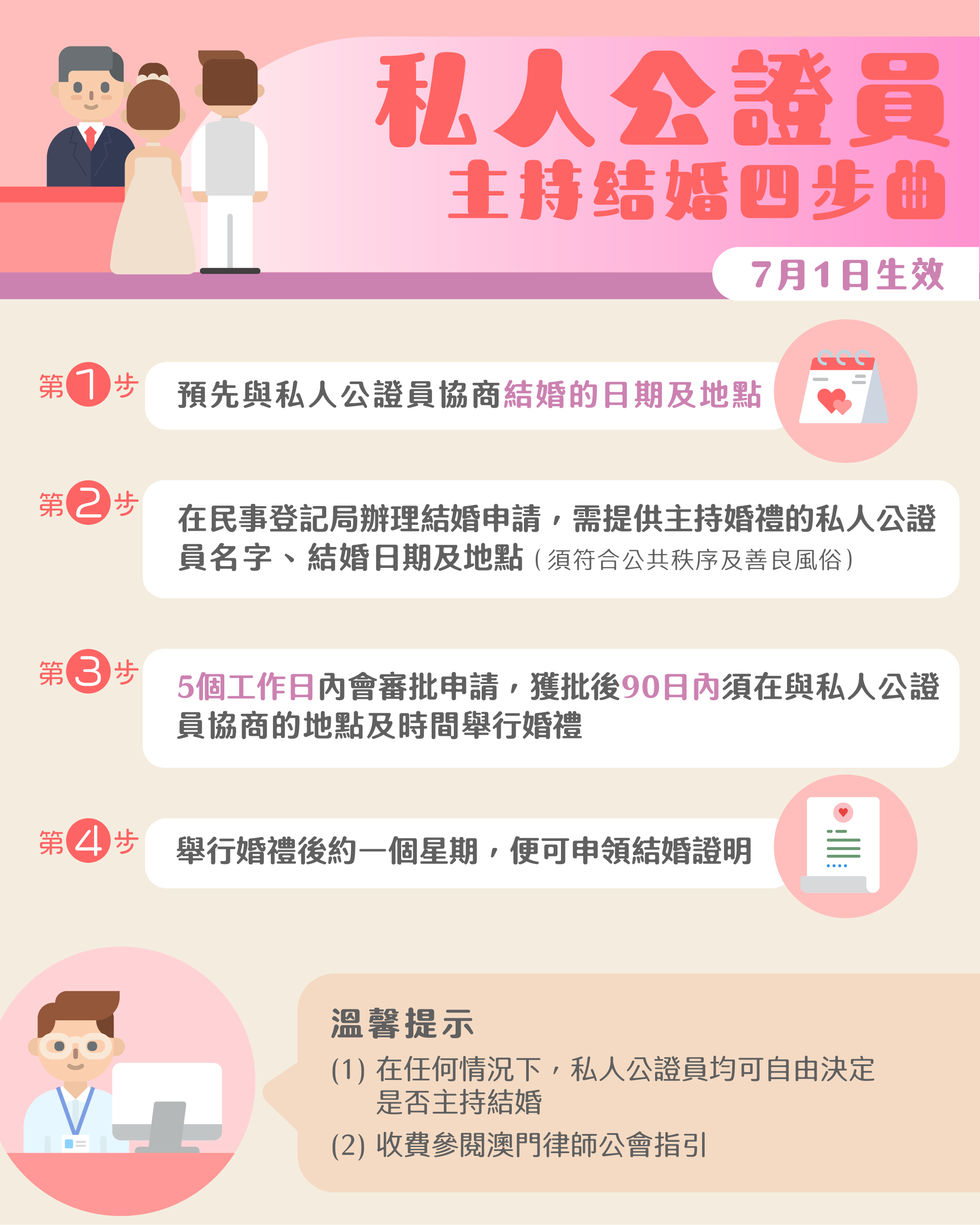 第11/2024號法律《修改〈民事登記法典〉》於今(1日)生效,新增賦權私人公證員主持結婚;民事登記局與公共部門及本地醫院間的資料互聯互通,以實現出生和死亡登記及結婚申請的全程電子化等。