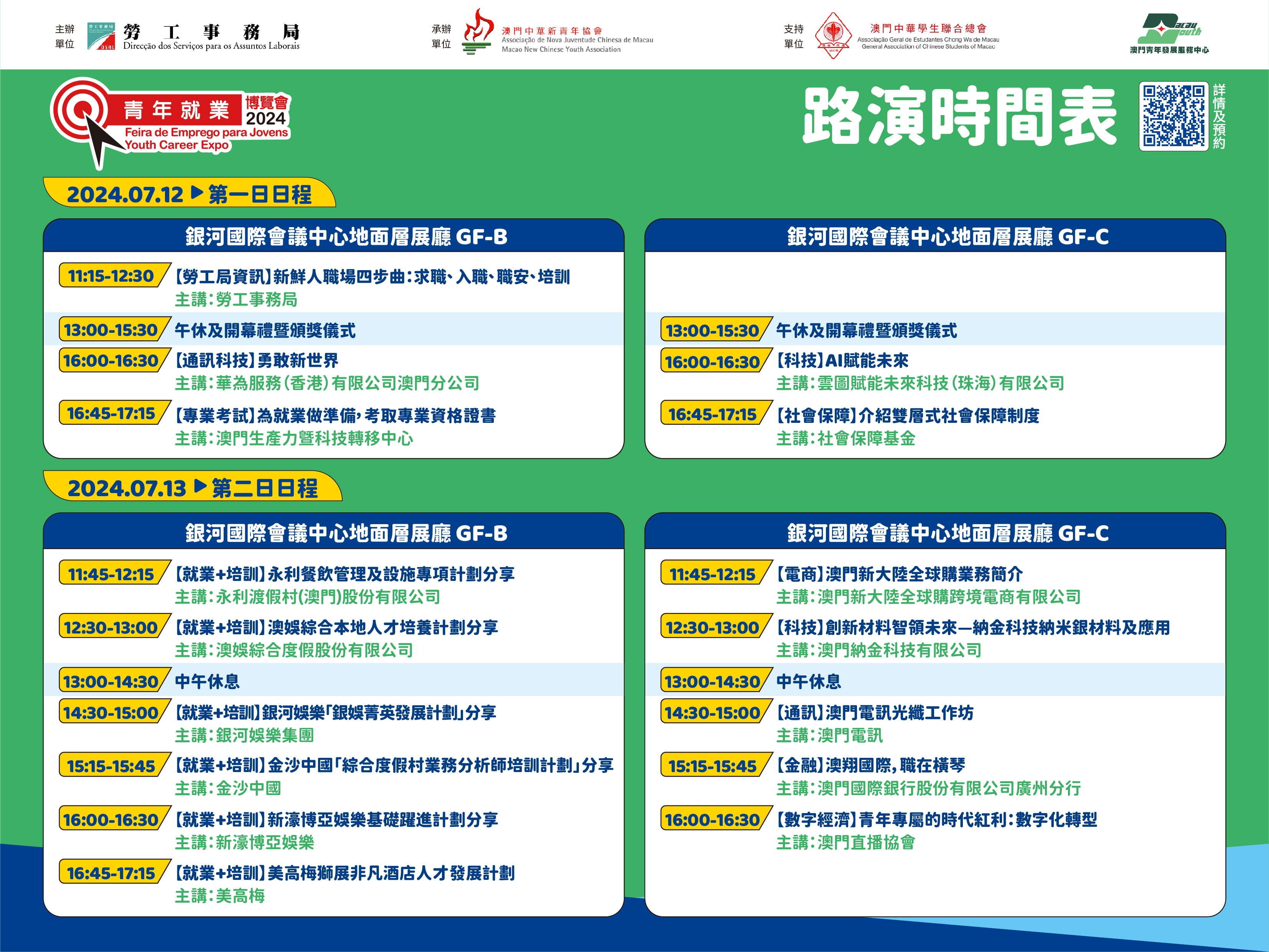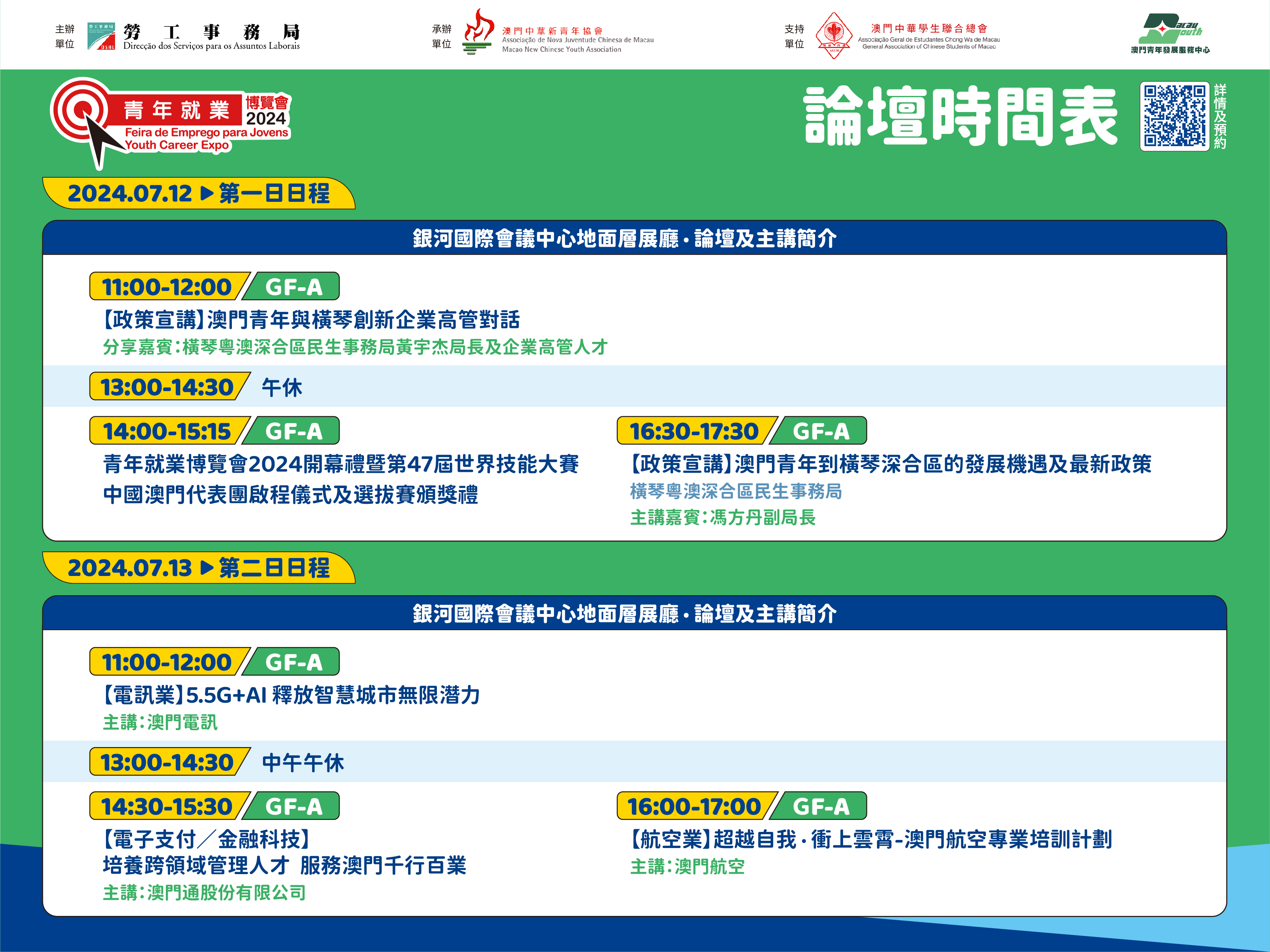 為做好進場的人流管理,有意參加上述各項活動的人士請提早網上預約,成功預約人士可獲發入場短訊,憑短訊優先入場,倘預約情況踴躍,體驗展區內如有需要,亦會派籌進行分流管理,明起至7月12日可登入勞工局青年就業博覽會專頁(https://www.dsal.gov.mo/zh_tw/standard/youthcareerexpo2024.html),從速預約,名額有限。