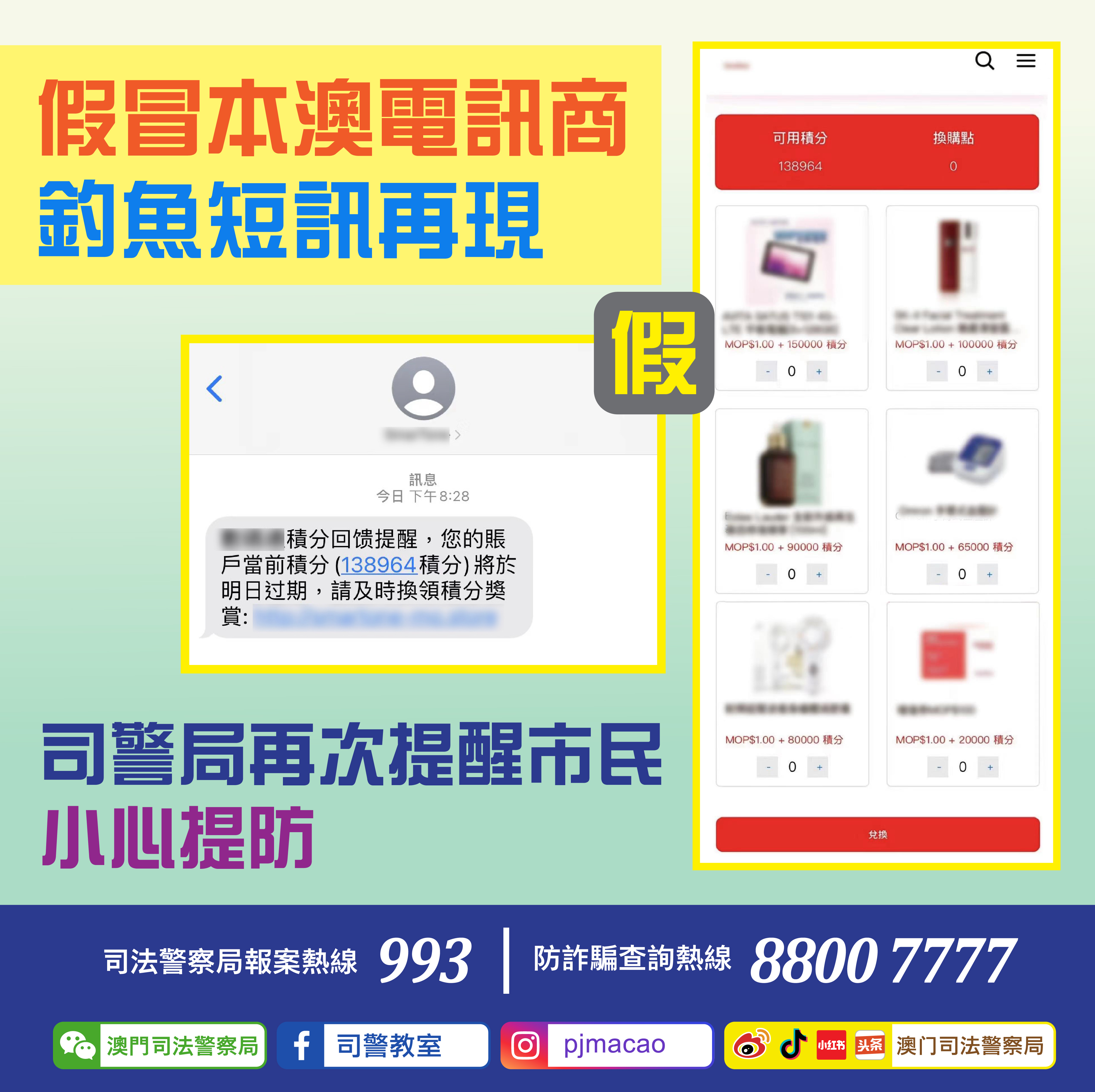 近日,司法警察局接獲市民檢舉,指收到假冒本澳某電訊公司的手機短訊,內容以積分點數到期須盡快換領獎賞為由,要求事主登入假冒網站,藉此套取個人及信用卡資料。