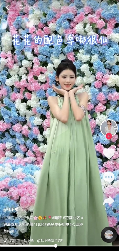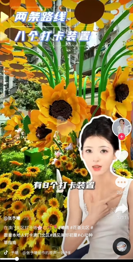 配合“花薈北區”打卡裝置的推出,經科局邀請到內地人氣女藝人、《乘風2024》姐姐“張予曦”親臨澳門打卡“花薈北區”及品嘗北區美食,澳門北區打卡短片在抖音發佈3日,已錄得逾418萬播放量。