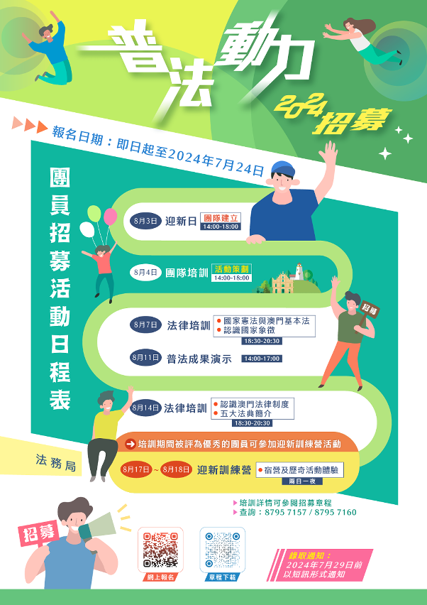 為鼓勵更多青少年參與普法工作,法務局由即日起至7月24日招募新一期“普法動力”團員,正就讀本澳中學中三至中六和大專院校的學生,均可報名參加。