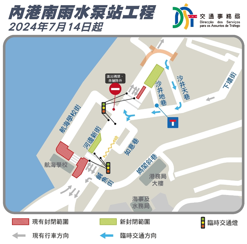 配合內港南雨水泵站及下水道工程的推進,於7月14日(周日)起,下環街近河邊新街的路段將恢復通車,航海學校則維持封閉交通,而河邊新街實施有限度通車的路段則有所調整(詳見附表)。