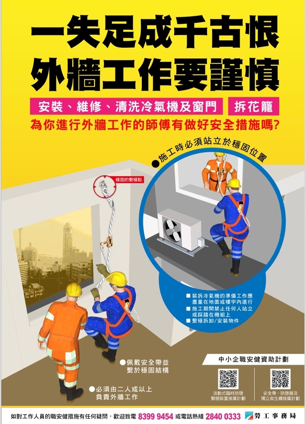 勞工局亦針對安裝、維修、清洗冷氣機作出職安健宣傳及指引,並提供流動式臨時防墮繫穩裝置,及安全帶、防墮器和獨立救生繩推廣計劃,此外,並會定期舉辦建築安全特定訓練:高空工作安全課程和中小企攻略講座等。時刻教導工人做好施工安全,並配合巡查、督促和指導,保障工人的工作安全與健康。有關勞工事務局製作的相關安全指引小冊子,可參考以下網站連結。(https://www.dsal.gov.mo/dsso/zh_tw/standard/download_printed_matter_booklet.html)