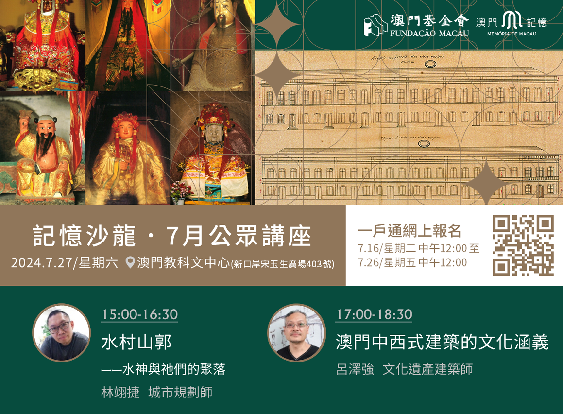 日前於“第二十七屆澳門書市嘉年華”舉辦的“記憶沙龍”書展特別場,由陳迎憲先生主講的“海洋的澳門:1445・琉球人抵達蠔鏡”座無虛席、氣氛熱絡。接續,本會將在7月27日(星期六)下午於澳門教科文中心推出兩場“記憶沙龍”(公開場),分別由城市規劃師林翊捷主講的“水村山郭——水神與祂們的聚落”和文化遺產建築師呂澤強主講的“澳門中西式建築的文化涵義”。