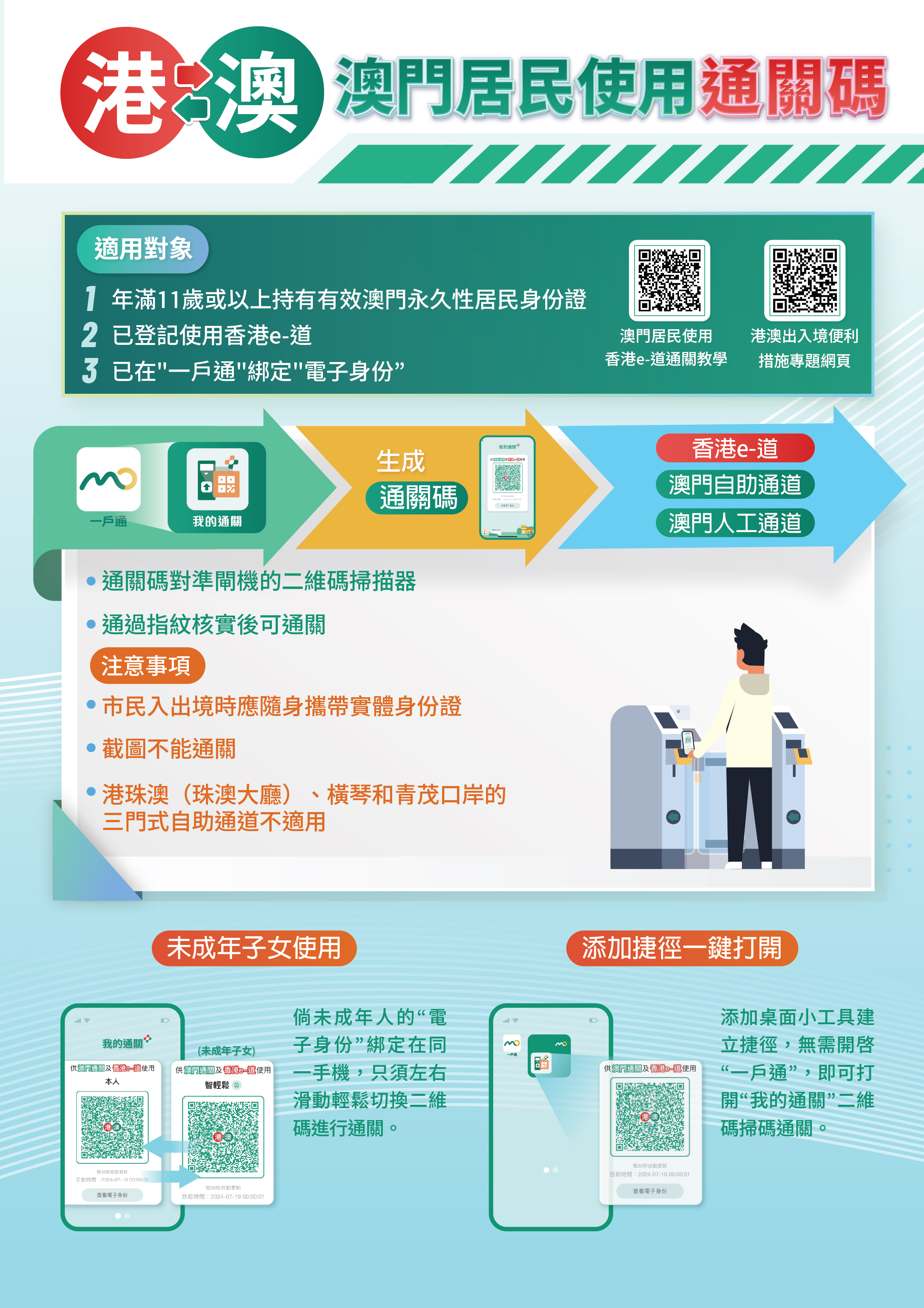 凡年滿11歲的澳門永久性居民身份證持有人,成功登記使用香港e-道服務及在“一戶通”綁定電子身份後,便可於通關時打開一戶通“我的通關”生成“港澳通關二維碼”,使用香港e-道服務入出境香港。如未成年人的“電子身份”綁定在父/母或監護人的手機上,隨行過關時,父母或監護人只須在“我的通關”二維碼介面左右滑動,便可輕鬆切換為對應人士的二維碼。