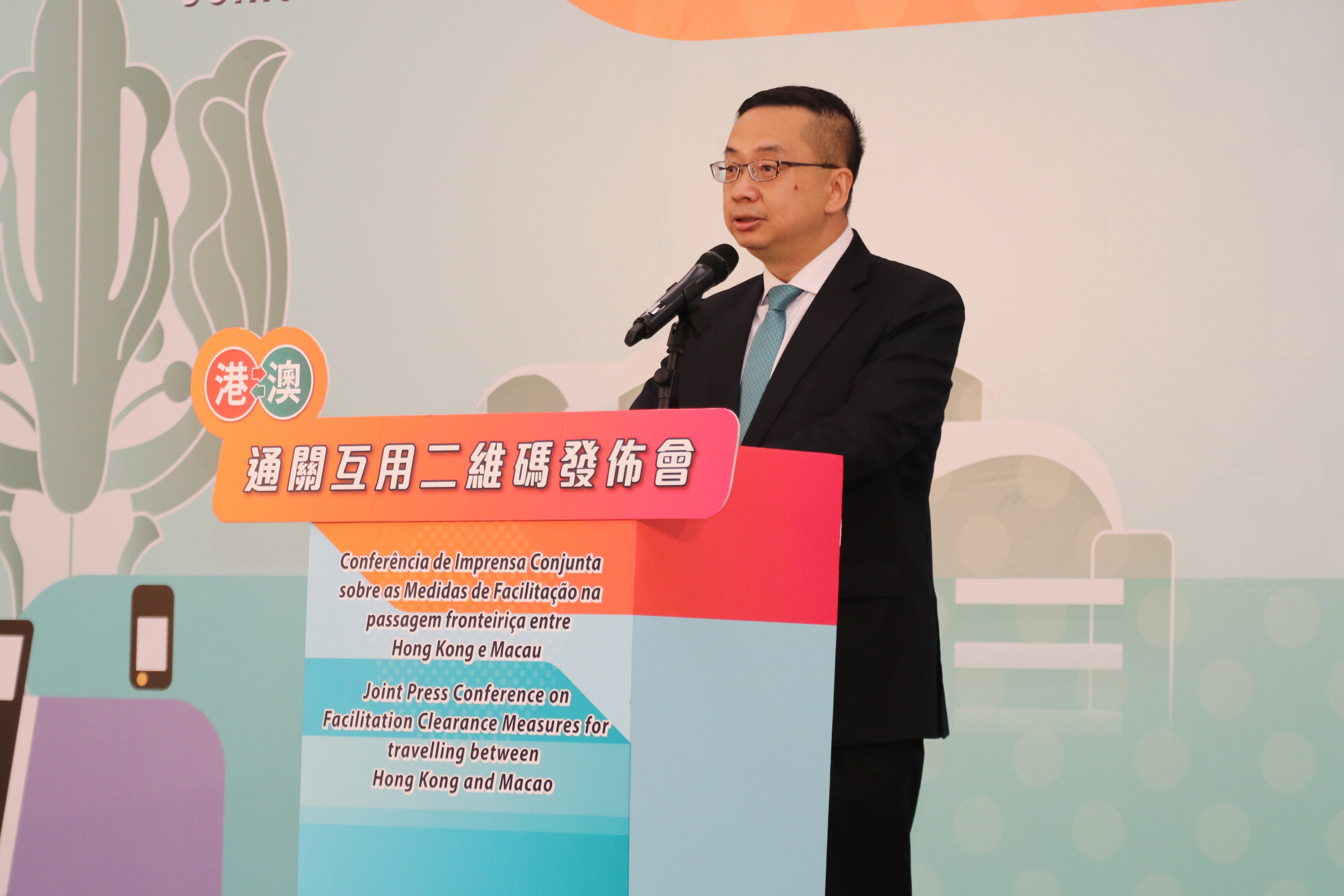 香港入境事務處處長郭俊峯致辭時表示,港澳兩地人員往來頻繁,至今已累積近二百五十萬合資格香港居民登記使用澳門自助通道服務。新推出的「港澳通關互用二維碼」服務,會為使用自助過關服務的港澳居民帶來更好的出行體驗,增加幸福感,並進一步提升兩地出入境服務質素,以配合大灣區發展的國家重大戰略。