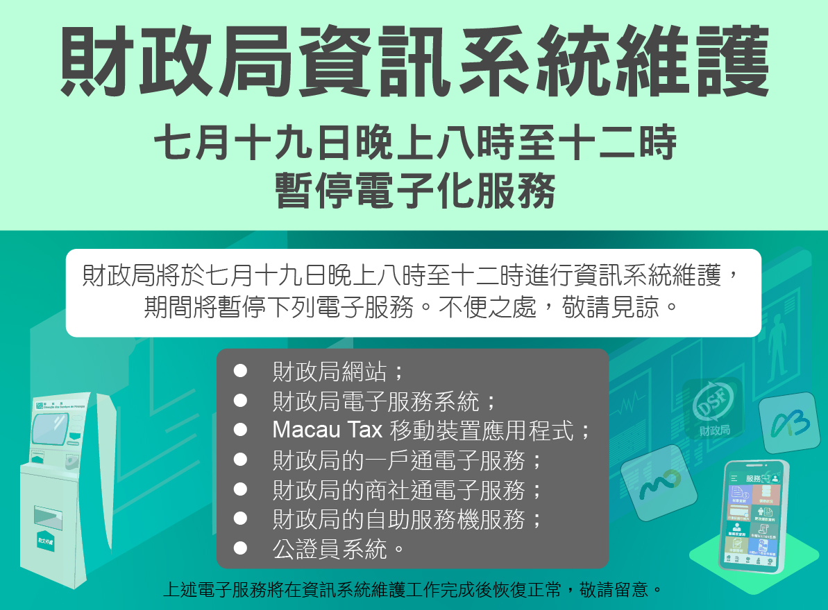 財政局將於七月十九日晚上八時至十二時進行資訊系統維護,期間將暫停下列電子服務。不便之處,敬請見諒。