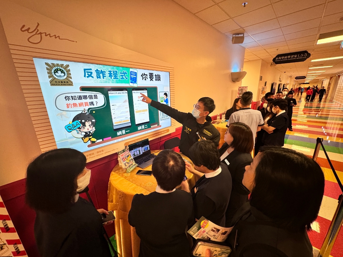 近年來部分旅遊博彩業從業員不慎墮入電訊及網絡詐騙陷阱,為切實增強業界的防範意識及能力,司法警察局應永利渡假村(澳門)股份有限公司邀請,日前共同合辦“永利防騙推廣活動暨防騙大使嘉許禮”,並在該企業旗下各娛樂場後勤區設置防騙互動體驗及攤位遊戲,吸引逾2,400名員工到場瞭解最新防騙資訊。活動上,司警局向8人授予“防騙大使"榮譽稱號,以助局方在企業內部宣揚防騙訊息。