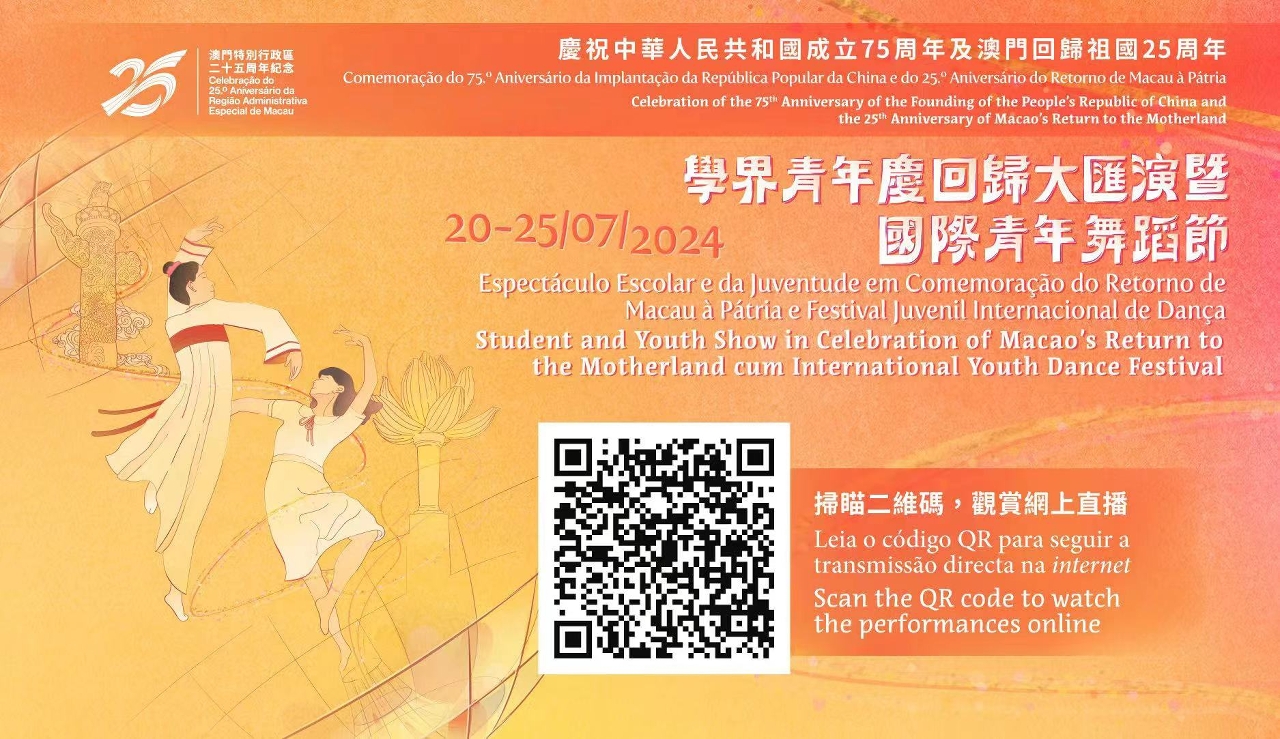 本次活動的重頭節目“學界青年慶回歸大匯演”將於明(22)日晚上8時在澳門綜藝館(綜藝一館)上演,請已登記並領取門票的觀眾提早到場。屆時澳廣視澳視澳門91台、澳門Macau衛星頻道96台、澳門蓮花衛視59台同步電視直播;同時,歡迎市民掃瞄網上直播二維碼一同觀賞,由澳門學界傳遞青年積極參與慶祝中華人民共和國成立75周年及澳門回歸祖國25周年活動的精彩演出。