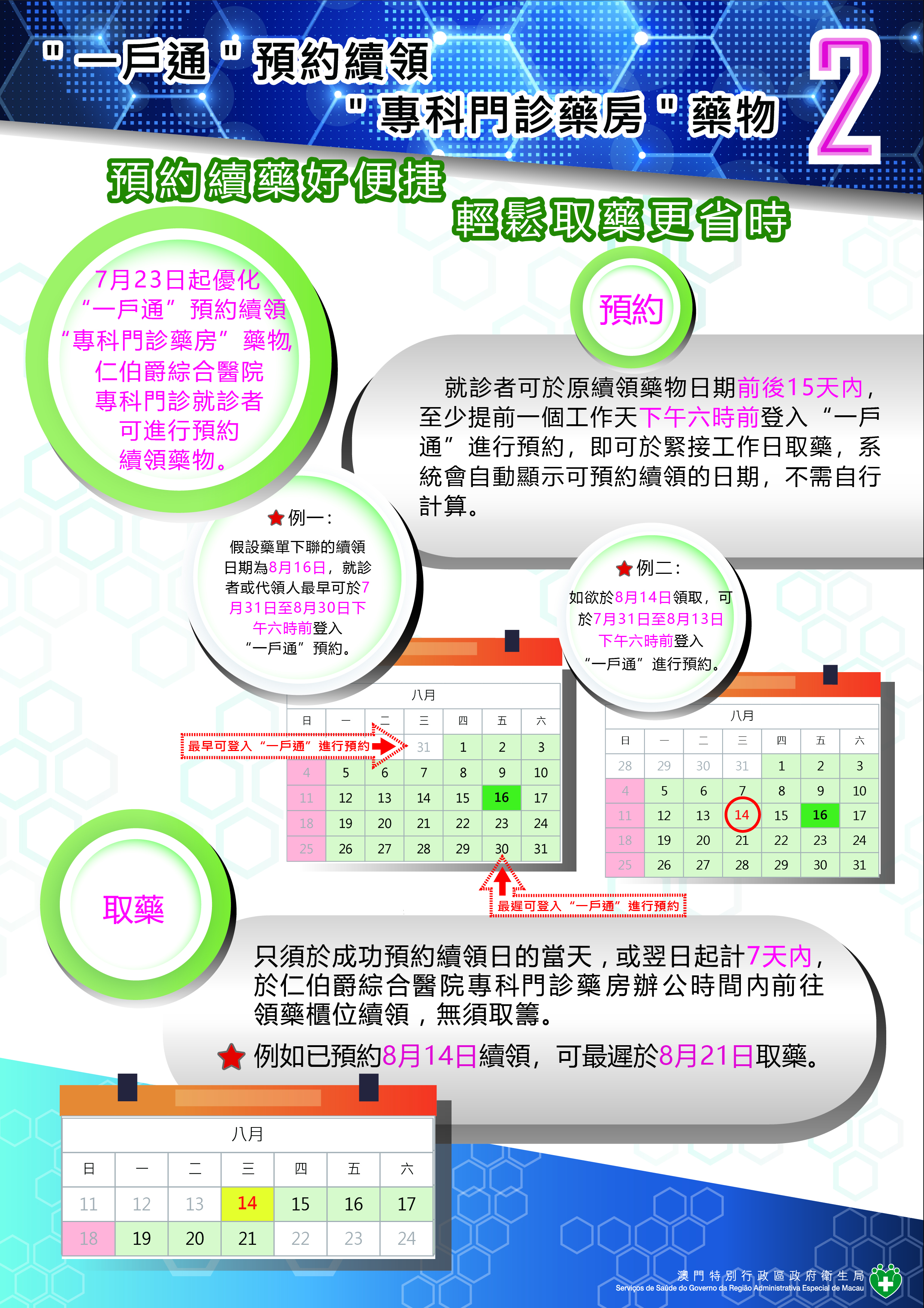 為配合特區政府電子政務發展,推動智慧醫療,進一步便利就診者或代領人領取仁伯爵綜合醫院專科門診藥物和縮短輪候領藥時間,衛生局於7月23日起優化“一戶通”預約續領“專科門診藥房"藥物服務,包括延長可續領藥物的日期及預約時間,具體如下: