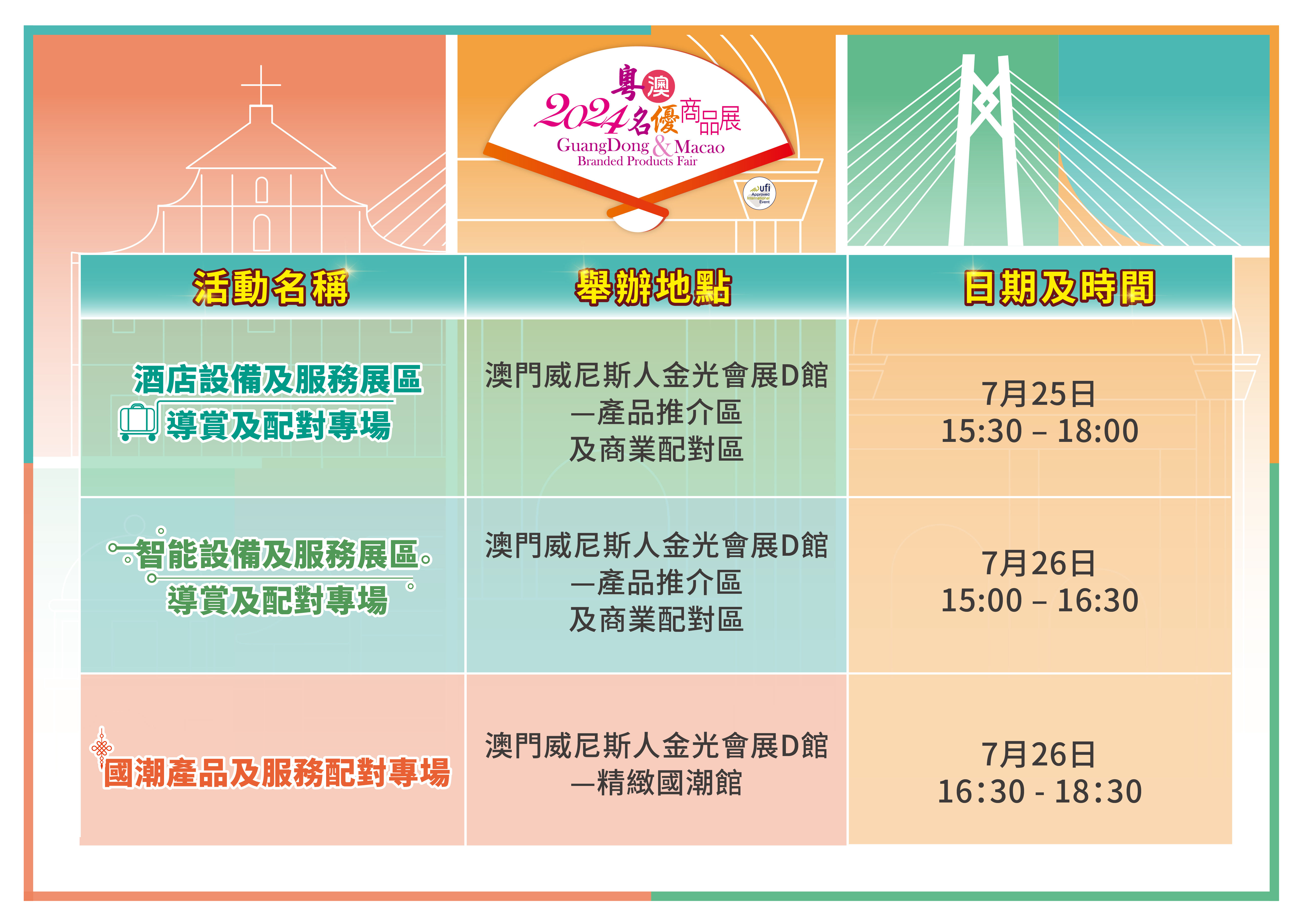 “粵澳名優商品展”不單是粵澳兩地大型經貿交流活動之一,亦是已成功獲得國際展覽業協會(UFI)認證的專業展會。如欲了解展會詳情,可瀏覽官方網站: www.guangdongmacaofair.com,電話:(853)8798 9636,關注微信:澳門會展(MICE_IPIM)或臉書:粵澳名優商品展。