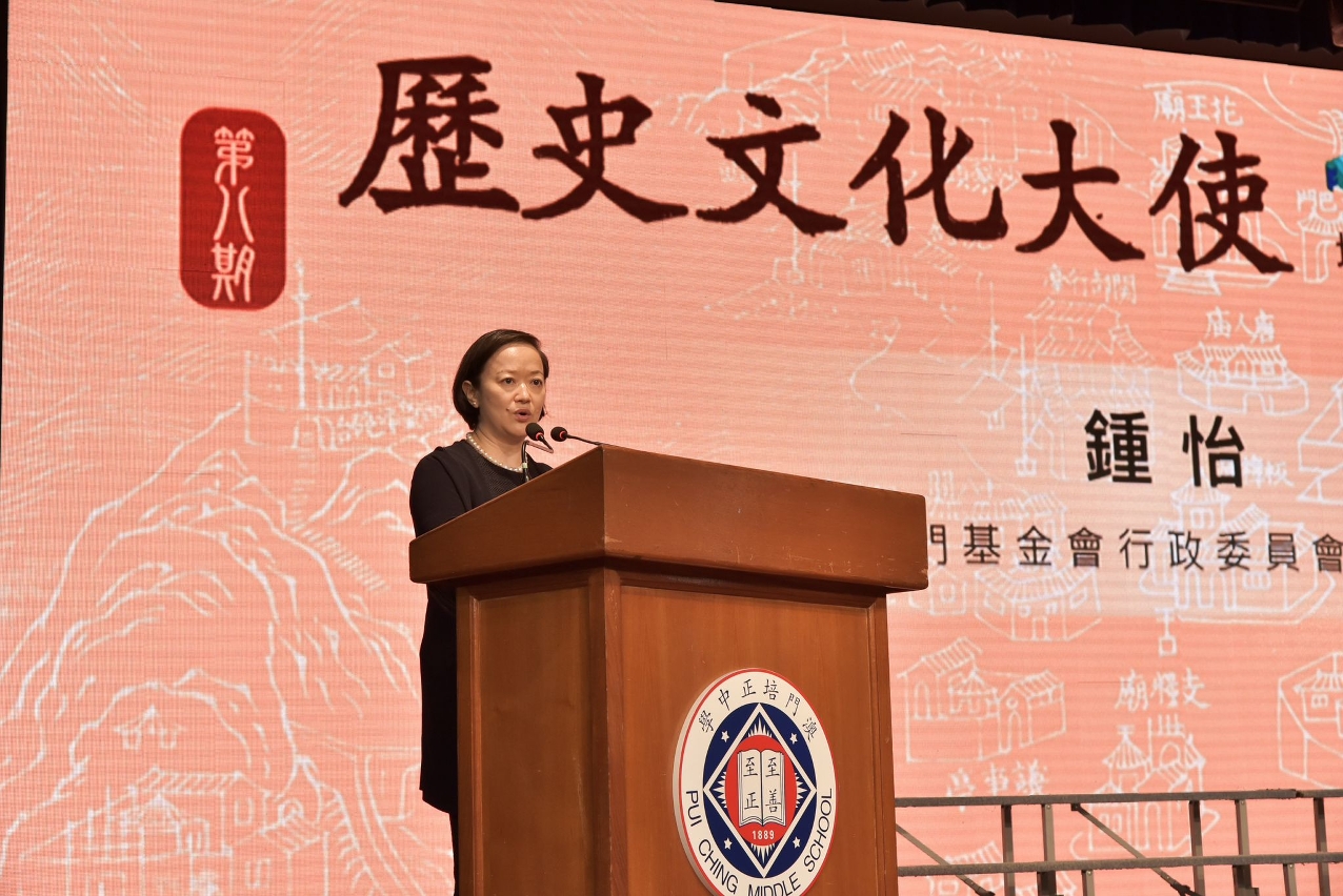 鍾怡代主席致辭時表示,澳門作為粵港澳大灣區內以中華文化為主流、多元文化共存的交流合作基地,在弘揚 “澳門歷史城區” 世界遺產的突出普遍價值,有賴社會各界的共同協作和努力。特別是作為未來社會棟樑的青年學生們,我們更有責任向他們傳承中華優秀傳統文化和澳門獨特文化價值。該計劃自2018年起與澳門歷史教育學會合辦,至今已舉辦八期,有近千名師生和居民報讀,培育出的種子學生和種子青年,在弘揚澳門傳統的人文關懷,以及培養熱愛家國的歸屬情感方面,都起到積極的帶頭作用。她期望計劃能得到更多支持,繼續舉辦,寄語學員們能成為真正的歷史文化大使,將澳門歷史文化的優良傳統一代一代地傳承下去。
