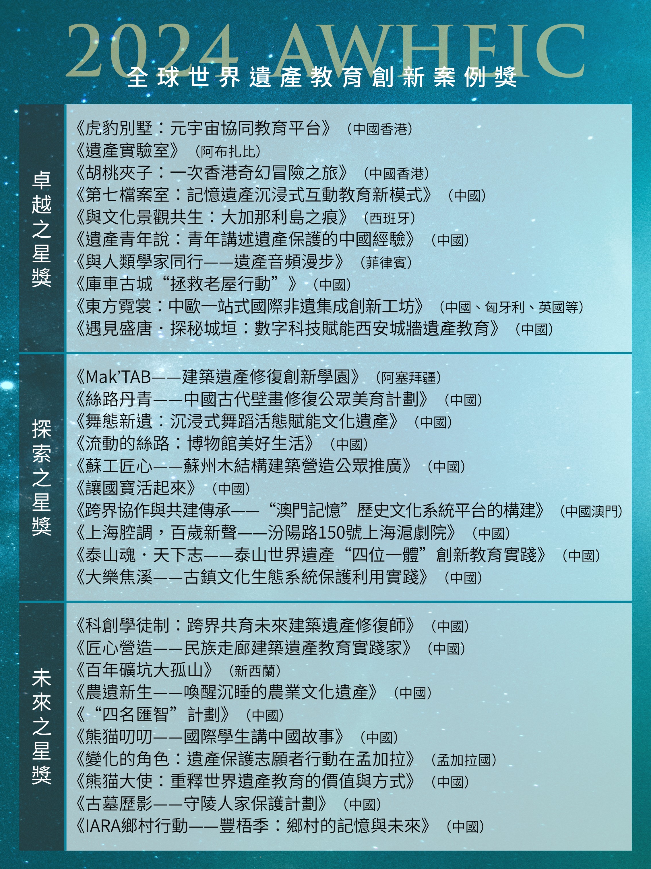 《全球世界遺產教育創新案例獎》的設立是對世界範圍內各種活化歷史遺產項目的鼓勵和認可,特別是透過現代科技增強世界遺產教育的系統性、創新性和普惠性,加強國際交流與合作方面取得巨大成果的予以嘉許。