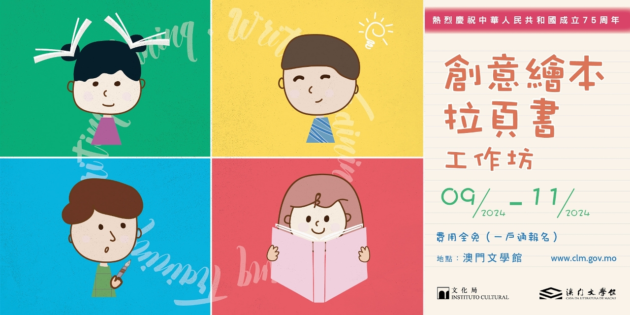 “創意繪本拉頁書工作坊”分別於9月21日、9月22日、10月5日、10月6日、11月9日及11月10日,下午3時至5時在澳門文學館舉行,對象為8至12歲的兒童,需由一位家長陪同參與。工作坊將以澳門街道為主軸,導師透過講故事的形式解說不同街道名稱的由來,同時介紹街道周邊的特色文化和建築物,引導參加者分享自己的小故事,繪畫出一本屬於自己的拉頁書。