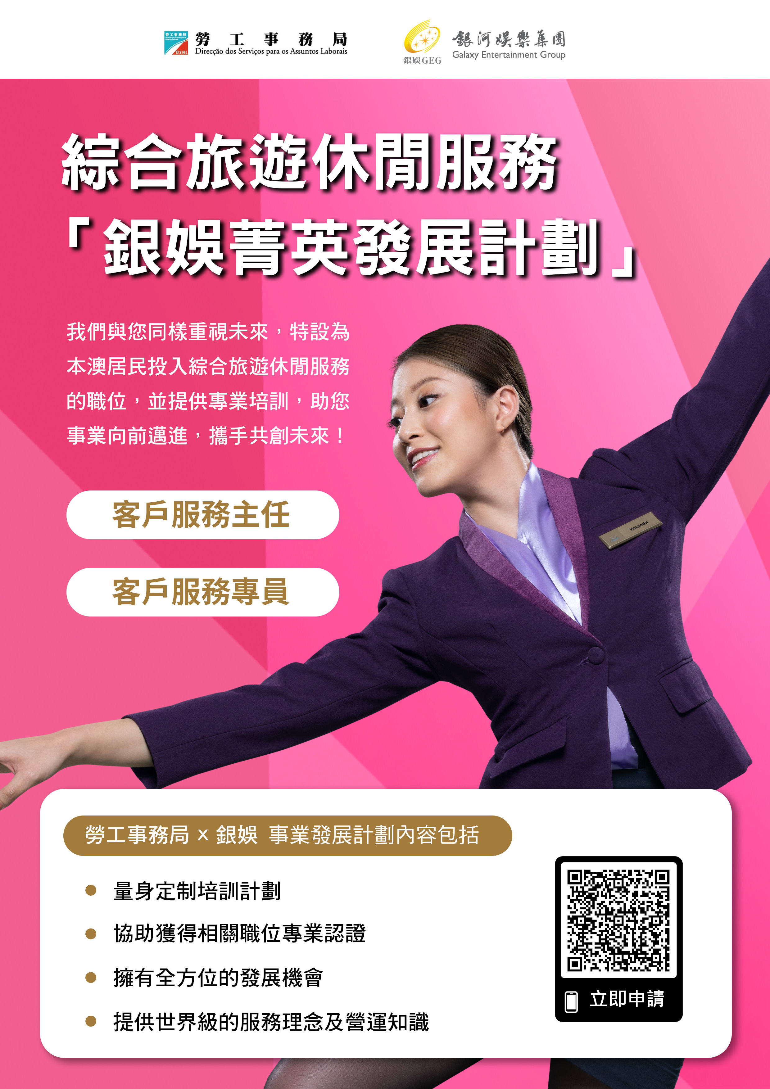 為支持本地人才全面發展,拓展多元職涯路向,勞工事務局與銀河娛樂集團(下稱“銀河娛樂")合作推出“銀娛菁英發展計劃(綜合娛樂服務範疇)"(下稱“計劃"),以“先入職、後培訓”方式,為有志投身綜合旅遊休閒服務行業的澳門居民提供全方位培訓及事業發展機會,計劃由8月27日起接受申請。