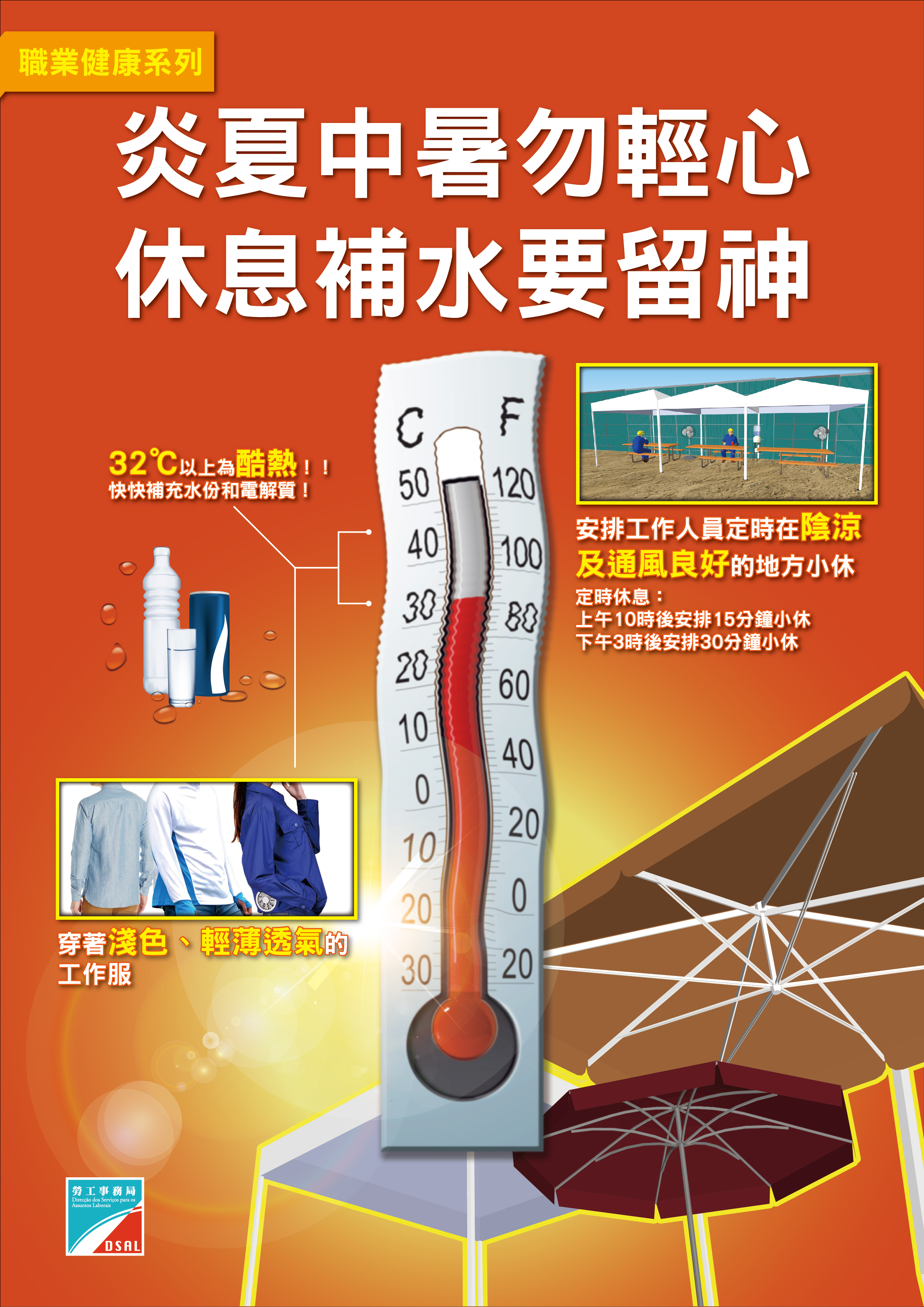 勞工局正推出「抗熱服及防曬帽套」及「便攜式掛腰風扇」推廣計劃,以及備有《熱帶氣旋、暴雨及特殊天氣等情況下的工作安全指引》及預防中暑的海報,歡迎巿民瀏覽和索取。如欲獲取更多職安健資訊,歡迎瀏覽勞工局職安健天地網頁www.dsal.gov.mo,亦可致電28717781或電郵dsaldsso@dsal.gov.mo查詢。