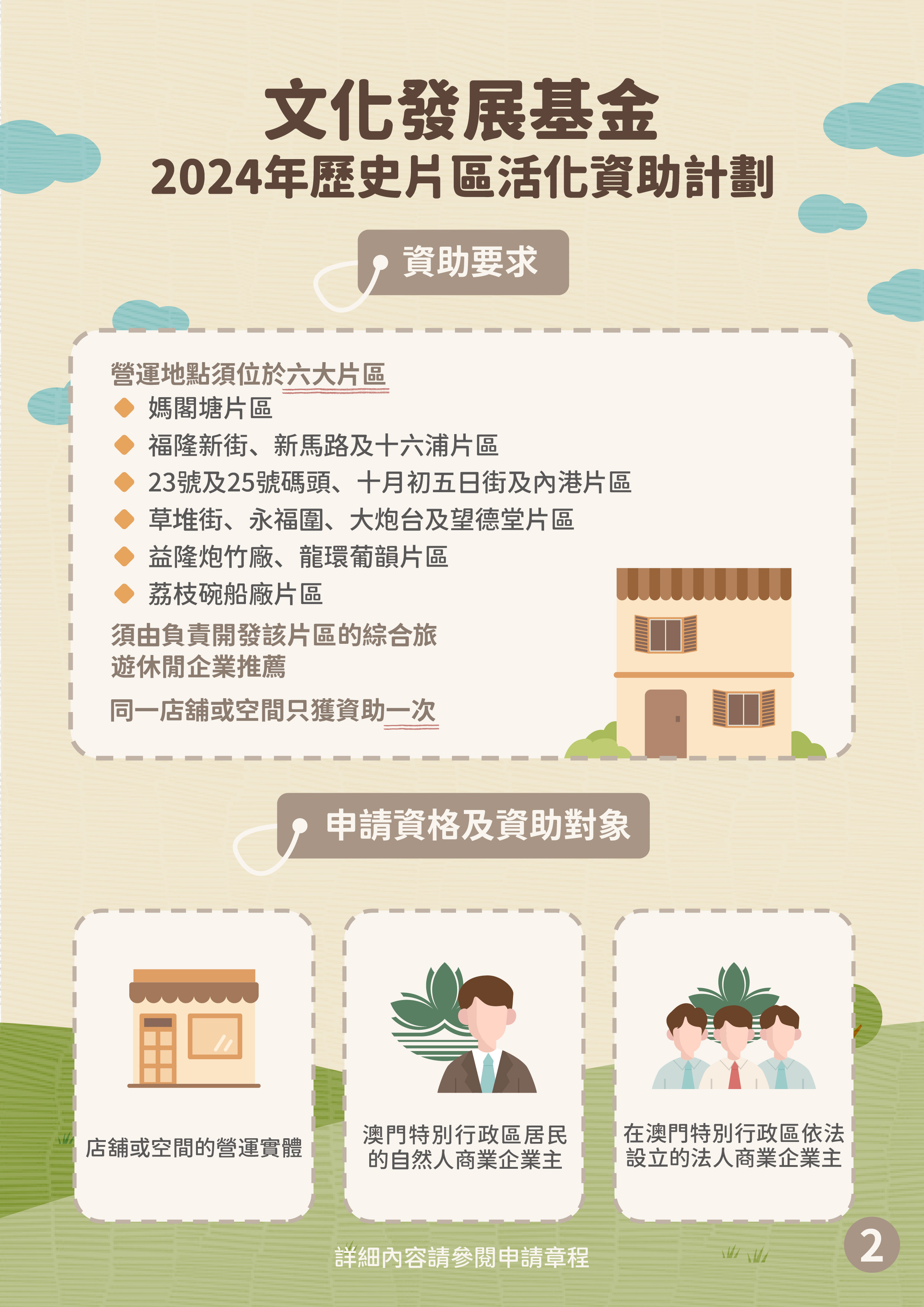申請人須為在澳門依法設立的自然人商業企業主或法人商業企業主,且為店舖或空間的營運實體。申請項目的營運地點須位於六大片區,並獲得負責開發該片區的綜合旅遊休閒企業的推薦,同一店舖或空間只可就本資助計劃獲得一次資助。