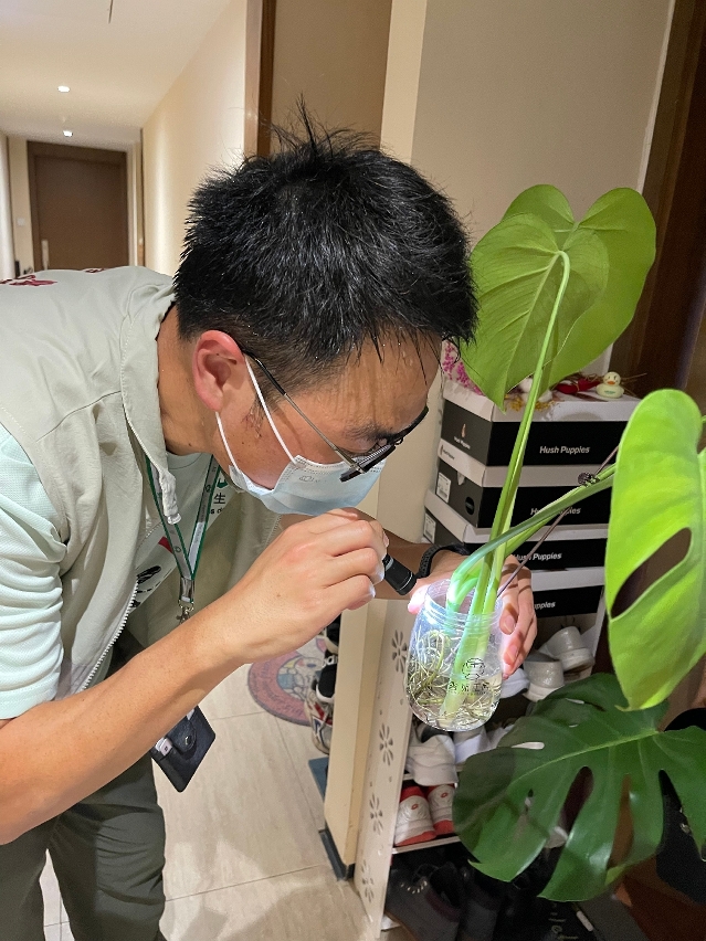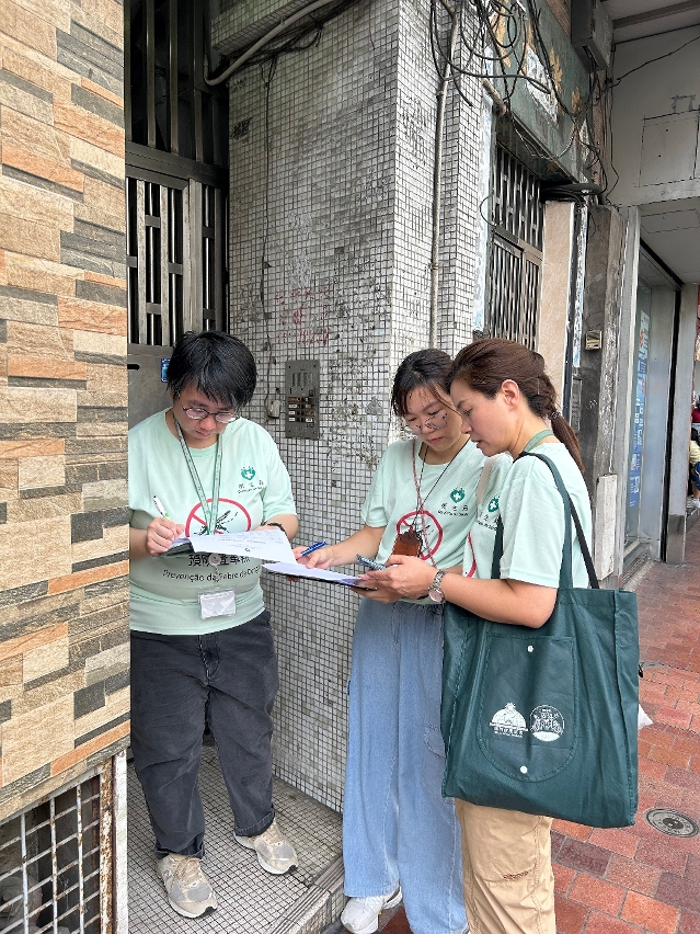今(9)日,衛生局工作人員在穿著制服及佩戴工作證可供居民識別的情況下,已在澳門青草街及周邊街道逐家逐戶地進行登革熱病例搜索,並設臨時抽血站為有疑似登革熱症狀人士進行抽血送檢,以便儘早發現病例;與此同時,也即場向居民宣傳防範登革熱及清除孳生源的重要性。衛生局強調,登革熱是通過帶病毒的白紋伊蚊叮咬人而傳播,會根據外地確診病例在澳門的活動軌跡進行風險評估和開展防範性措施,包括在外地確診病例的活動軌跡、居住地點和工作地點逐家逐戶地進行登革熱病例搜索、展開伊蚊孳生源調查和安排化學滅蚊。