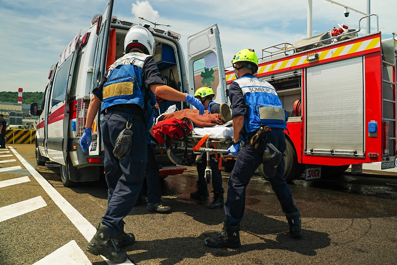 演習模擬澳門大橋電單車專道(澳門往氹仔方向)有兩部電單車發生碰撞及起火,現場有兩名傷者(其中一名重傷),途經駕駛者見狀在安全情況下將傷者扶至安全位置並報案求助。