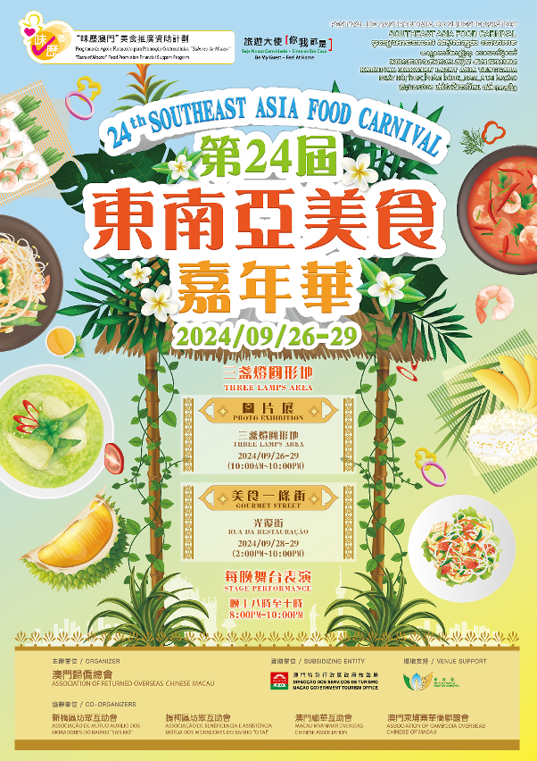 “第二十四屆東南亞美食嘉年華”於9月26日至29日、一連四日在三盞燈圓形地和光復街一帶舉行,活動包括美食一條街、文藝晚會和東南亞國家著名景點圖片展等。多間本地東南亞特色餐飲商號參與活動,一同宣傳三盞燈周邊的特式美食,展現澳門多元飲食文化,為澳門“創意城市美食之都”的美譽增姿添彩。