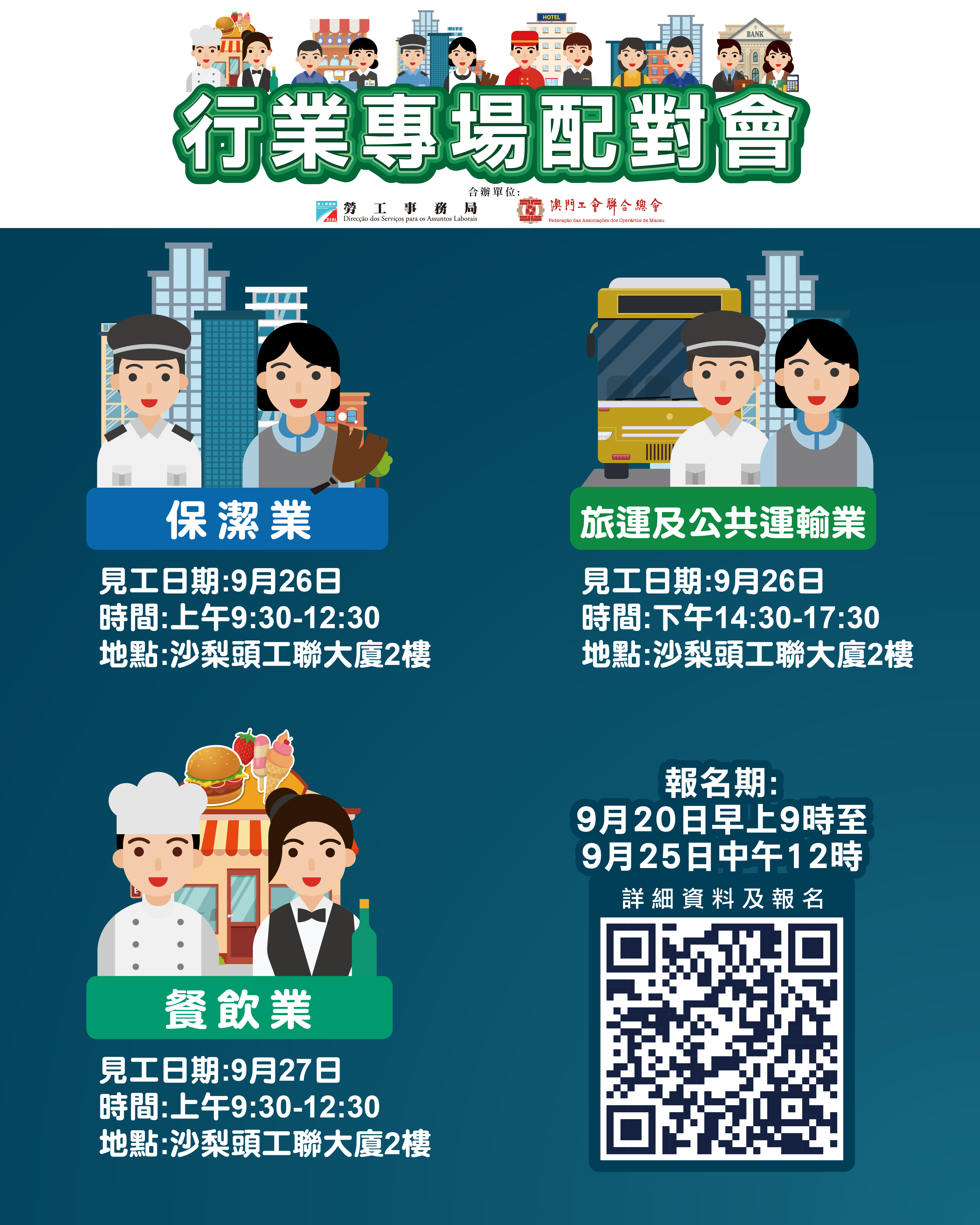 9月26日上午舉辦保潔業配對會,提供59個職位空缺,涉及保安主任、高級保安員及清潔員等。下午舉辦旅運及公共運輸業配對會,提供46個職位空缺,涉及車長、站長、安全督導員及夜間安全專員。