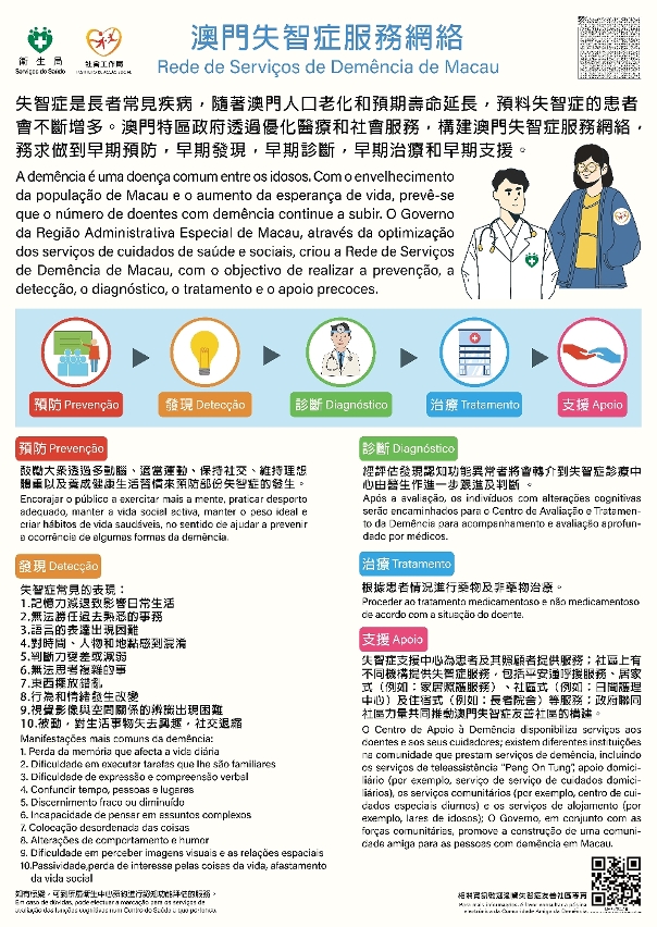 此外,衛生局聯同社會工作局、澳門失智症協會共同舉辦澳門特區失智症友善大聯盟交流會,邀請已加盟的高等院校、醫療專業團體、長者服務機構、青年服務機構及學校等代表作分享,促進彼此的交流與合作。衛生局亦製作了預防失智症宣傳片,並與社會工作局共同製作了多款相關宣傳海報。欲了解更多失智症資訊,歡迎瀏覽澳門失智症友善社區專頁(https://www.ssm.gov.mo/mdfc/)。